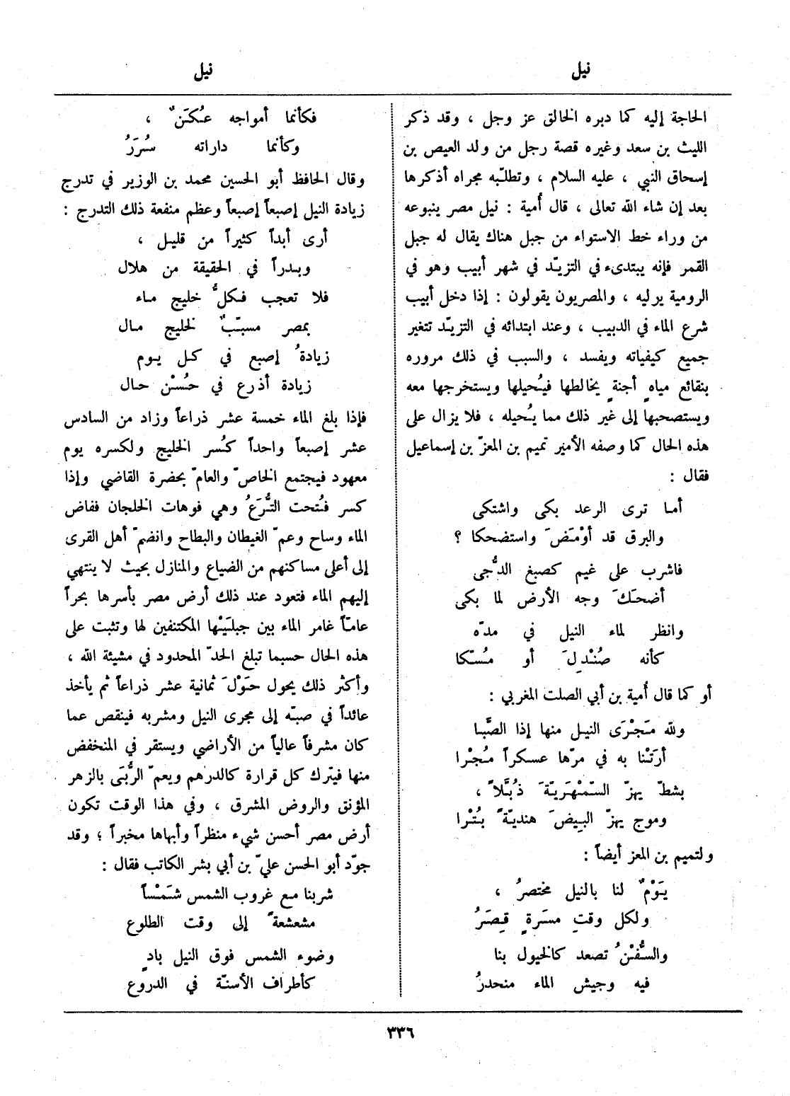 فإذا بلغ الماء خمسة عشر ذراعا وزاد من السادس عشر إصبعا واحدا كسر الخليج ولكسره يوم معهود فيجتمع الخاصّ والعامّ بحضرة القاضي وإذا كسر فتحت التّرع وهي فوهات الخلجان ففاض الماء وساح وعمّ الغيطان والبطاح وانضمّ أهل القرى إلى أعلى مساكنهم من الضياع والمنازل بحيث لا ينتهي إليهم الماء فتعود عند ذلك أرض مصر بأسرها بحرا عامّا غامر الماء بين جبليها المكتنفين لها وتثبت على هذه الحال حسبما تبلغ الحدّ المحدود في مشيئة الله، وأكثر ذلك يحول حول ثمانية عشر ذراعا ثم يأخذ عائدا في صبّه إلى مجرى النيل ومشربه فينقص عما كان مشرفا عاليا من الأراضي ويستقر في المنخفض منها فيترك كل قرارة كالدرهم ويعمّ الرّبى بالزهر المؤنق والروض المشرق، وفي هذا الوقت تكون أرض مصر أحسن شيء منظرا وأبهاها مخبرا، وقد جوّد أبو الحسن عليّ بن أبي بشر الكاتب فقال: