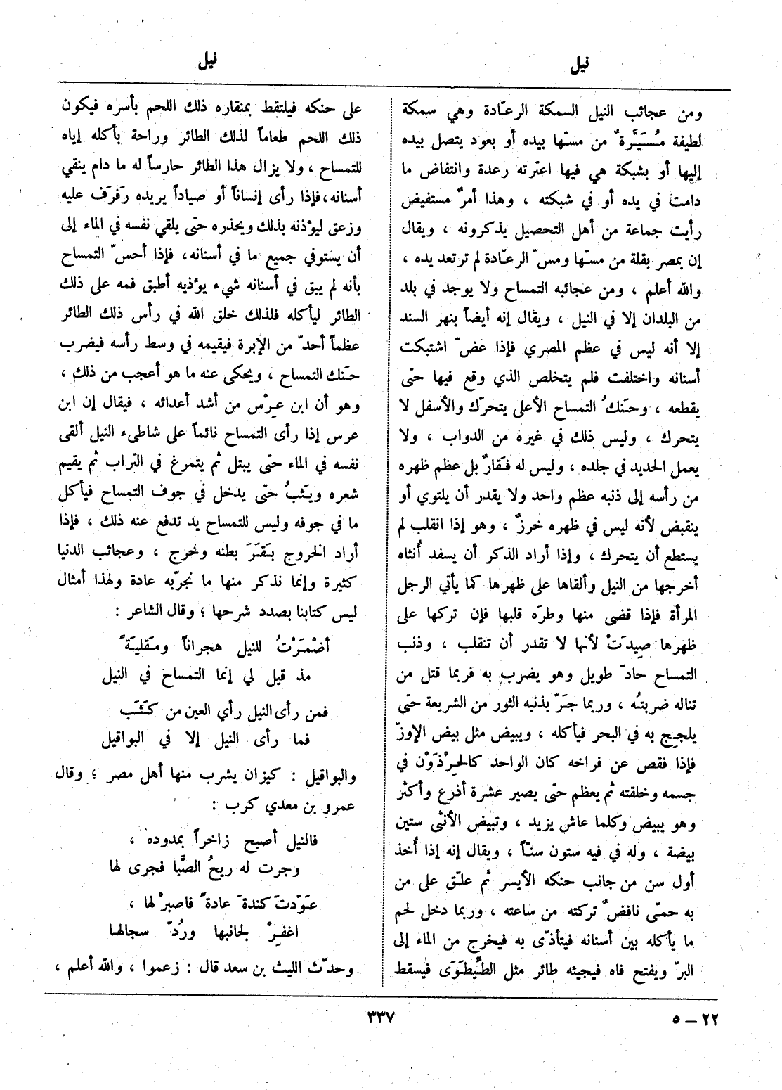 ومن عجائب النيل السمكة الرعّادة وهي سمكة لطيفة مسيّرة من مسّها بيده أو بعود يتصل بيده إليها أو بشبكة هي فيها اعترته رعدة وانتفاض ما دامت في يده أو في شبكته، وهذا أمر مستفيض رأيت جماعة من أهل التحصيل يذكرونه، ويقال إن بمصر بقلة من مسّها ومسّ الرعّادة لم ترتعد يده، والله أعلم، ومن عجائبه التمساح ولا يوجد في بلد من البلدان إلا في النيل، ويقال إنه أيضا بنهر السند إلا أنه ليس في عظم المصري فإذا عضّ اشتبكت أسنانه واختلفت فلم يتخلص الذي وقع فيها حتى يقطعه، وحنك التمساح الأعلى يتحرّك والأسفل لا يتحرك، وليس ذلك في غيره من الدواب، ولا يعمل الحديد في جلده، وليس له فقار بل عظم ظهره من رأسه إلى ذنبه عظم واحد ولا يقدر أن يلتوي أو ينقبض لأنه ليس في ظهره خرز، وهو إذا انقلب لم يستطع أن يتحرك، وإذا أراد الذكر أن يسفد أنثاه أخرجها من النيل وألقاها على ظهرها كما يأتي الرجل المرأة فإذا قضى منها وطره قلبها فإن تركها على ظهرها صيدت لأنها لا تقدر أن تنقلب، وذنب التمساح حادّ طويل وهو يضرب به فربما قتل من تناله ضربته، وربما جرّ بذنبه الثور من الشريعة حتى يلجج به في البحر فيأكله، ويبيض مثل بيض الإوزّ فإذا فقص عن فراخه كان الواحد كالحرذون في جسمه وخلقته ثم يعظم حتى يصير عشرة أذرع وأكثر وهو يبيض وكلما عاش يزيد، وتبيض الأنثى ستين بيضة، وله في فيه ستون سنّا، ويقال إنه إذا أخذ أول سن من جانب حنكه الأيسر ثم علّق على من به حمّى نافض تركته من ساعته، وربما دخل لحم ما يأكله بين أسنانه فيتأذّى به فيخرج من الماء إلى البرّ ويفتح فاه فيجيئه طائر مثل الطّيطوى فيسقط على حنكه فيلتقط بمنقاره ذلك اللحم بأسره فيكون ذلك اللحم طعاما لذلك الطائر وراحة بأكله إياه للتمساح، ولا يزال هذا الطائر حارسا له ما دام ينقي أسنانه، فإذا رأى إنسانا أو صيادا يريده رفرف عليه وزعق ليؤذنه بذلك ويحذره حتى يلقي نفسه في الماء إلى أن يستوفي جميع ما في أسنانه، فإذا أحسّ التمساح بأنه لم يبق في أسنانه شيء يؤذيه أطبق فمه على ذلك الطائر ليأكله فلذلك خلق الله في رأس ذلك الطائر عظما أحدّ من الإبرة فيقيمه في وسط رأسه فيضرب حنك التمساح، ويحكى عنه ما هو أعجب من ذلك، وهو أن ابن عرس من أشد أعدائه، فيقال إن ابن عرس إذا رأى التمساح نائما على شاطئ النيل ألقى نفسه في الماء حتى يبتل ثم يتمرغ في التراب ثم يقيم شعره ويثب حتى يدخل في جوف التمساح فيأكل ما في جوفه وليس للتمساح يد تدفع عنه ذلك، فإذا أراد الخروج بقر بطنه وخرج، وعجائب الدنيا كثيرة وإنما نذكر منها ما نجرّبه عادة ولهذا أمثال ليس كتابنا بصدد شرحها، وقال الشاعر: