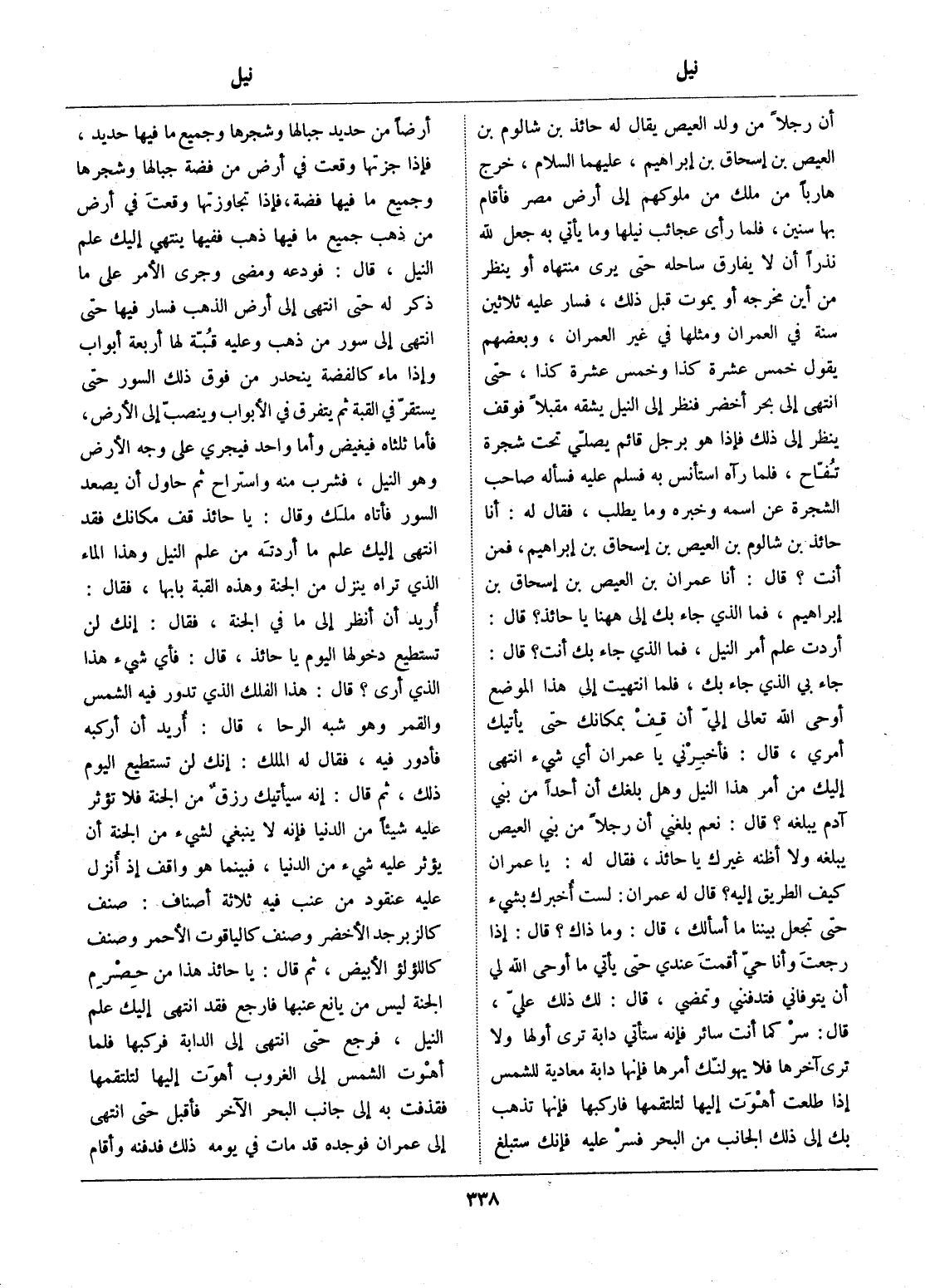 جاء بي الذي جاء بك، فلما انتهيت إلى هذا الموضع أوحى الله تعالى إليّ أن قف بمكانك حتى يأتيك أمري، قال: فأخبرني يا عمران أي شيء انتهى إليك من أمر هذا النيل وهل بلغك أن أحدا من بني آدم يبلغه؟ قال: نعم بلغني أن رجلا من بني العيص يبلغه ولا أظنه غيرك يا حائذ، فقال له: يا عمران كيف الطريق إليه؟ قال له عمران: لست أخبرك بشيء حتى تجعل بيننا ما أسألك، قال: وما ذاك؟ قال: إذا رجعت وأنا حيّ أقمت عندي حتى يأتي ما أوحى الله لي أن يتوفاني فتدفني وتمضي، قال: لك ذلك عليّ، قال: سر كما أنت سائر فإنه ستأتي دابة ترى أولها ولا ترى آخرها فلا يهولنّك أمرها فإنها دابة معادية للشمس إذا طلعت أهوت إليها لتلتقمها فاركبها فإنها تذهب بك إلى ذلك الجانب من البحر فسر عليه فإنك ستبلغ أرضا من حديد جبالها وشجرها وجميع ما فيها حديد، فإذا جزتها وقعت في أرض من فضة جبالها وشجرها وجميع ما فيها فضة، فإذا تجاوزتها وقعت في أرض من ذهب جميع ما فيها ذهب ففيها ينتهي إليك علم النيل، قال: فودعه ومضى وجرى الأمر على ما ذكر له حتى انتهى إلى أرض الذهب فسار فيها حتى انتهى إلى سور من ذهب وعليه قبّة لها أربعة أبواب وإذا ماء كالفضة ينحدر من فوق ذلك السور حتى يستقرّ في القبة ثم يتفرق في الأبواب وينصبّ إلى الأرض، فأما ثلثاه فيغيض وأما واحد فيجري على وجه الأرض وهو النيل، فشرب منه واستراح ثم حاول أن يصعد السور فأتاه ملك وقال: يا حائذ قف مكانك فقد انتهى إليك علم ما أردته من علم النيل وهذا الماء الذي تراه ينزل من الجنة وهذه القبة بابها، فقال: