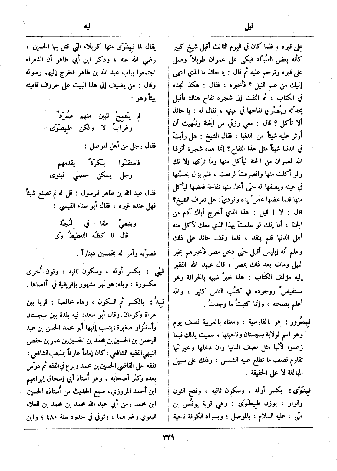 بكسر أوله، وسكون ثانيه، وفتح النون والواو، بوزن طيطوى: وهي قرية يونس بن متى، عليه السّلام، بالموصل، وبسواد الكوفة ناحية يقال لها نينوى منها كربلاء التي قتل بها الحسين، رضي الله عنه، وذكر ابن أبي طاهر أن الشعراء اجتمعوا بباب عبد الله بن طاهر فخرج إليهم رسوله وقال: من يضيف إلى هذا البيت على حروف قافيته بيتا وهو: