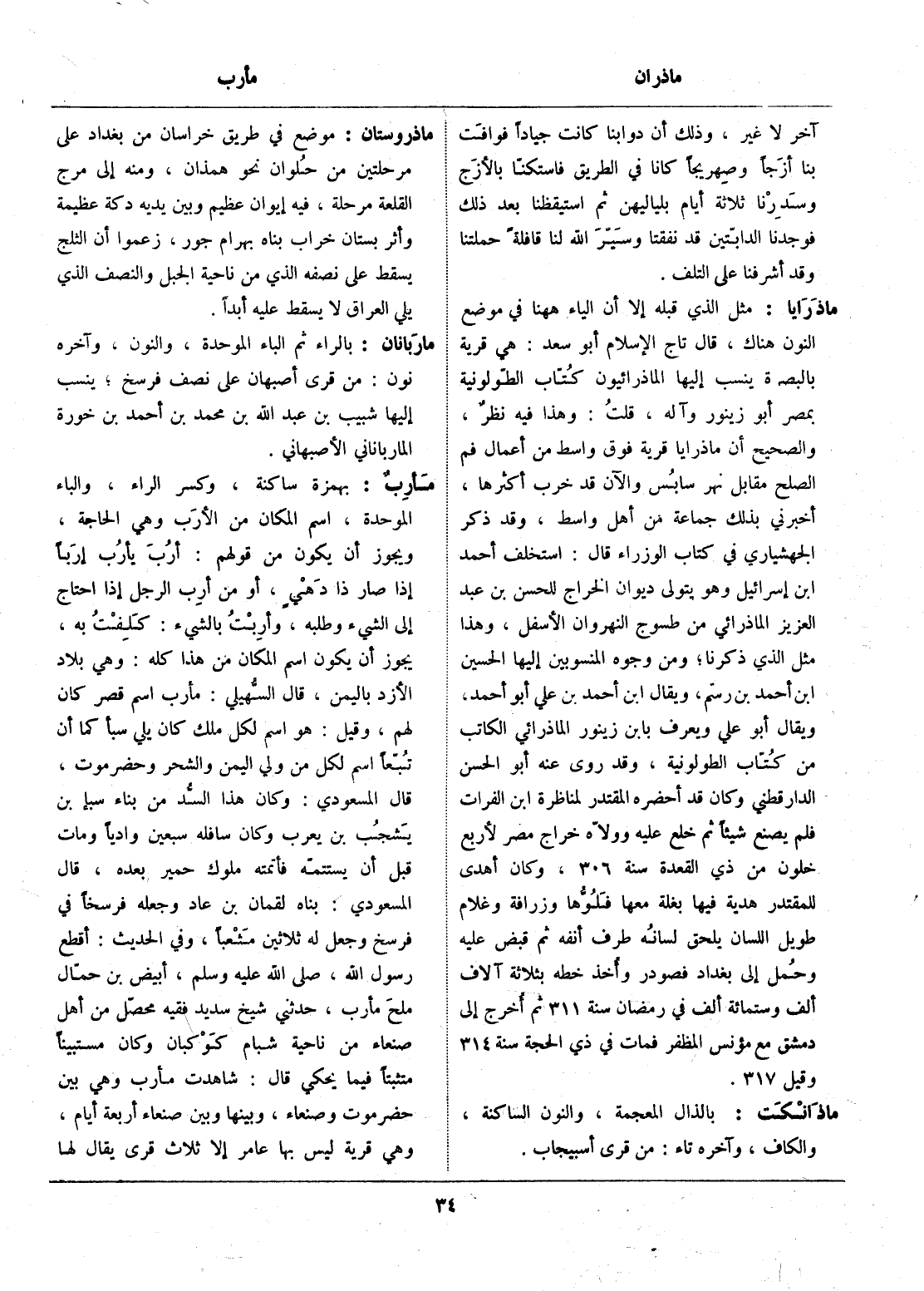 بهمزة ساكنة، وكسر الراء، والباء الموحدة، اسم المكان من الأرب وهي الحاجة، ويجوز أن يكون من قولهم: أرب يأرب إربا إذا صار ذا دهي، أو من أرب الرجل إذا احتاج إلى الشيء وطلبه، وأربت بالشيء: كلفت به، يجوز أن يكون اسم المكان من هذا كله: وهي بلاد الأزد باليمن، قال السّهيلي: مأرب اسم قصر كان لهم، وقيل: هو اسم لكل ملك كان يلي سبأ كما أن تبّعا اسم لكل من ولي اليمن والشحر وحضرموت، قال المسعودي: وكان هذا السُّد من بناء سبإ بن يشجب بن يعرب وكان سافله سبعين واديا ومات قبل أن يستتمّه فأتمته ملوك حمير بعده، قال المسعودي: بناه لقمان بن عاد وجعله فرسخا في فرسخ وجعل له ثلاثين مشعبا، وفي الحديث: أقطع رسول الله، صلّى الله عليه وسلّم، أبيض بن حمّال ملح مأرب، حدثني شيخ سديد فقيه محصّل من أهل صنعاء من ناحية شبام كوكبان وكان مستبينا متثبتا فيما يحكي قال: شاهدت مأرب وهي بين حضرموت وصنعاء، وبينها وبين صنعاء أربعة أيام، وهي قرية ليس بها عامر إلا ثلاث قرى يقال لها