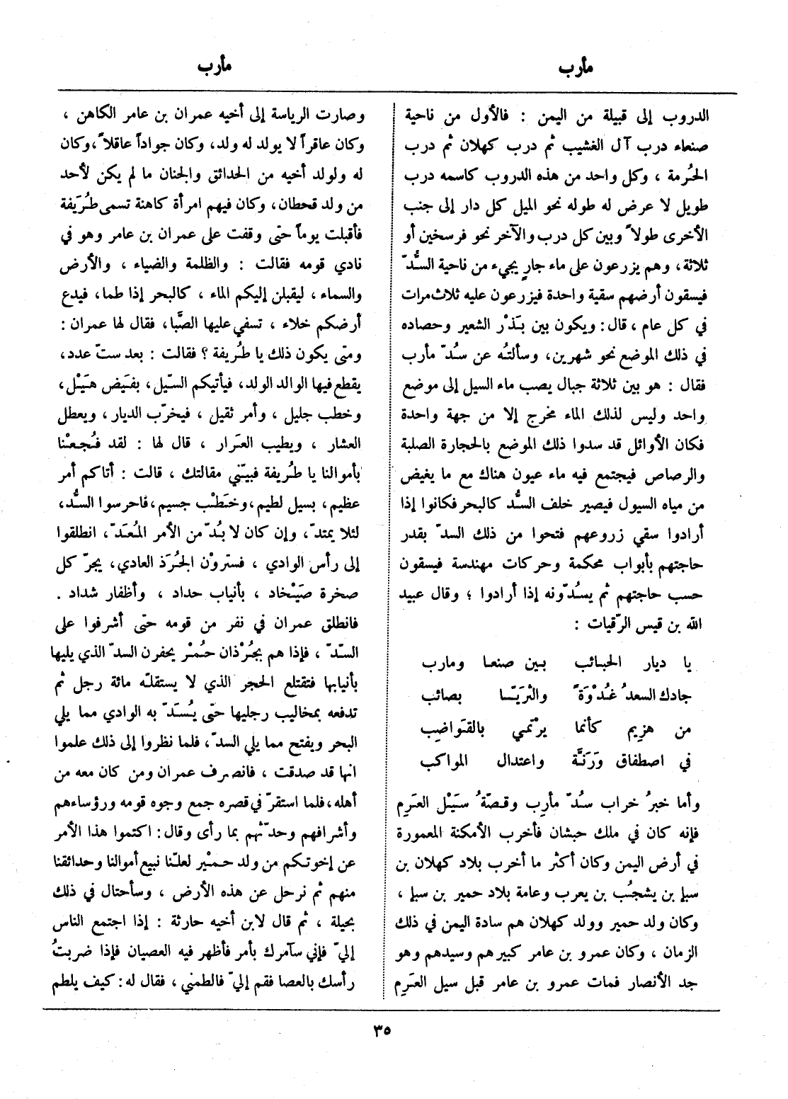 وأما خبر خراب سدّ مأرب وقصّة سيل العرم فإنه كان في ملك حبشان فأخرب الأمكنة المعمورة في أرض اليمن وكان أكثر ما أخرب بلاد كهلان بن سبإ بن يشجب بن يعرب وعامة بلاد حمير بن سبإ، وكان ولد حمير وولد كهلان هم سادة اليمن في ذلك الزمان، وكان عمرو بن عامر كبيرهم وسيدهم وهو جد الأنصار فمات عمرو بن عامر قبل سيل العرم وصارت الرياسة إلى أخيه عمران بن عامر الكاهن، وكان عاقرا لا يولد له ولد، وكان جوادا عاقلا، وكان له ولولد أخيه من الحدائق والجنان ما لم يكن لأحد من ولد قحطان، وكان فيهم امرأة كاهنة تسمى طريفة فأقبلت يوما حتى وقفت على عمران بن عامر وهو في نادي قومه فقالت: والظلمة والضياء، والأرض والسماء، ليقبلن إليكم الماء، كالبحر إذا طما، فيدع أرضكم خلاء، تسفي عليها الصّبا، فقال لها عمران: