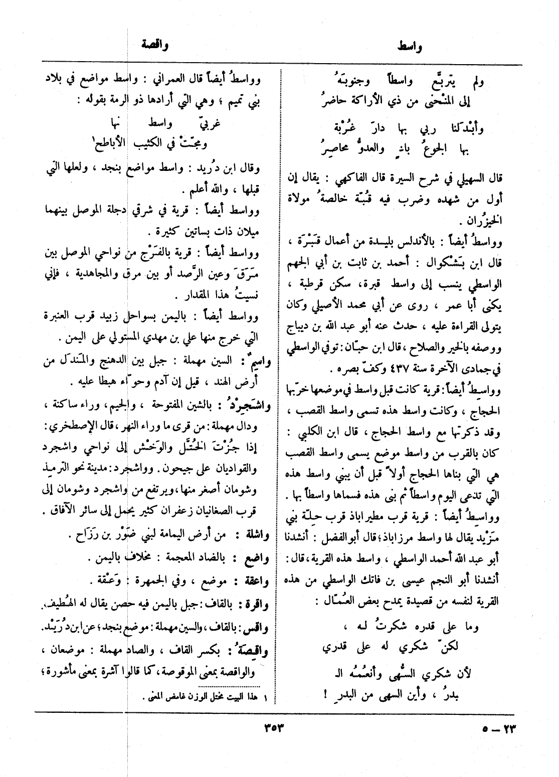 وواسط أيضا قال العمراني: واسط مواضع في بلاد بني تميم، وهي التي أرادها ذو الرمة بقوله:
