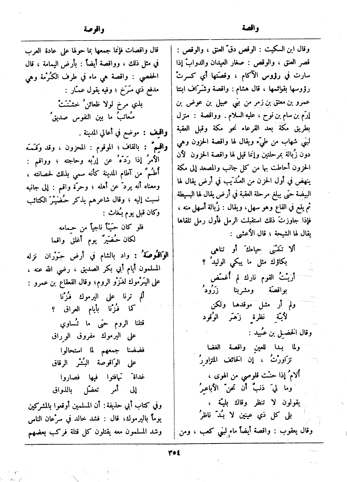 قصر العنق، والوقص: صغار العيدان والدوابّ إذا سارت في رؤوس الآكام، وقصتها أي كسرت رؤوسها بقوائمها، قال هشام: واقصة وشراف ابنتا عمرو بن معتق بن زمر من بني عبيل بن عوض بن إرم بن سام بن نوح، عليه السّلام. وواقصة: منزل بطريق مكة بعد القرعاء نحو مكة وقبل العقبة لبني شهاب من طيّء ويقال لها واقصة الحزون وهي دون زبالة بمرحلتين وإنما قيل لها واقصة الحزون لأن الحزون أحاطت بها من كل جانب والمصعد إلى مكة ينهض في أول الحزن من العذيب في أرض يقال لها البيضة حتى يبلغ مرحلة العقبة في أرض يقال لها البسيطة ثم يقع في القاع وهو سهل، ويقال: زبالة أسهل منه، فإذا جاوزت ذلك استقبلت الرمل فأول رمل تلقاها يقال لها الشيحة، قال الأعشى: