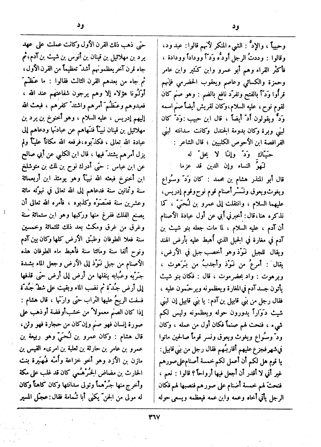 وحبيبا، والإدّ: الشيء المنكر لأنهم قالوا: عبد ود، وقالوا: وددت الرجل أودّه ودّا وودادا وودادة، فأكثر القراء وهم أبو عمرو وابن كثير وابن عامر وحمزة والكسائي وعاصم ويعقوب الحضرمي فإنهم قرأوا ودّا بالفتح وتفرّد نافع بالضم: وهو صنم كان لقوم نوح، عليه السّلام، وكان لقريش أيضا صنم اسمه ودّ ويقولون أدّ أيضا، قال ابن حبيب: ودّ كان لبني وبرة وكان بدومة الجندل وكانت سدانته لبني الفرافصة ابن الأحوص الكلبيين، قال الشاعر: