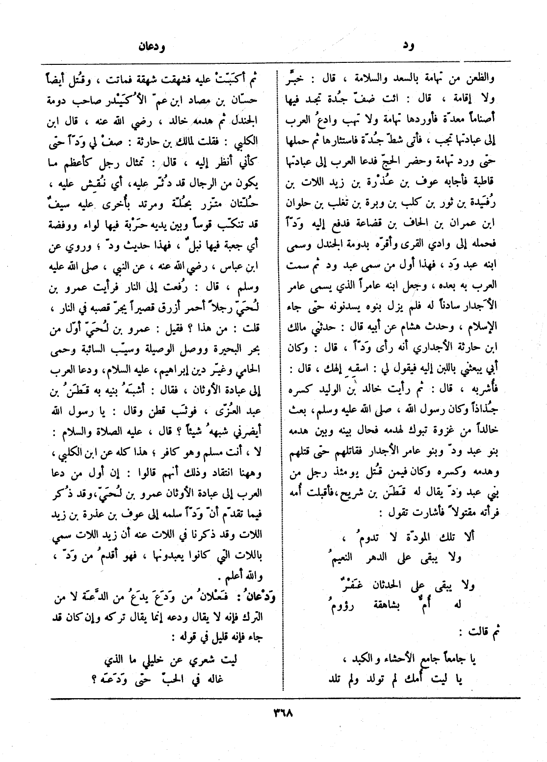 ثم أكبّت عليه فشهقت شهقة فماتت، وقتل أيضا حسّان بن مصاد ابن عمّ الأكيدر صاحب دومة الجندل ثم هدمه خالد، رضي الله عنه، قال ابن الكلبي: فقلت لمالك بن حارثة: صف لي ودّا حتى كأني أنظر إليه، قال: تمثال رجل كأعظم ما يكون من الرجال قد دثّر عليه، أي نقش عليه، حلّتان متّزر بحلّة ومرتد بأخرى عليه سيف قد تنكّب قوسا وبين يديه حربة فيها لواء ووفضة أي جعبة فيها نبل، فهذا حديث ودّ، وروي عن ابن عباس، رضي الله عنه، عن النبي، صلى الله عليه وسلم، قال: رفعت إلى النار فرأيت عمرو بن لحيّ رجلا أحمر أزرق قصيرا يجرّ قصبه في النار، قلت: من هذا؟ فقيل: عمرو بن لحيّ أوّل من بحر البحيرة ووصل الوصيلة وسيّب السائبة وحمى الحامي وغيّر دين إبراهيم، عليه السّلام، ودعا العرب إلى عبادة الأوثان، فقال: أشبه بنيه به قطن بن عبد العزّى، فوثب قطن وقال: يا رسول الله أيضرني شبهه شيئا؟ قال، عليه الصلاة والسلام: