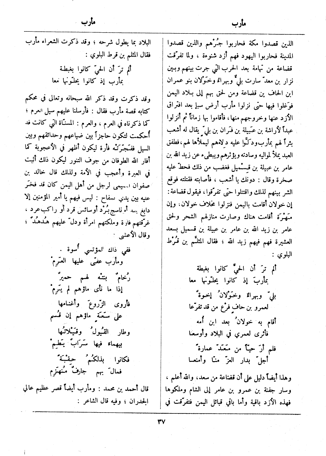 وهذا أيضا دليل على أن قضاعة من سعد، والله أعلم، وسار جفنة بن عمرو بن عامر إلى الشام وملكوها فهذه الأزد باقية وأما باقي قبائل اليمن فتفرّقت في البلاد بما يطول شرحه، وقد ذكرت الشعراء مأرب فقال المثلم بن قرط البلوي: