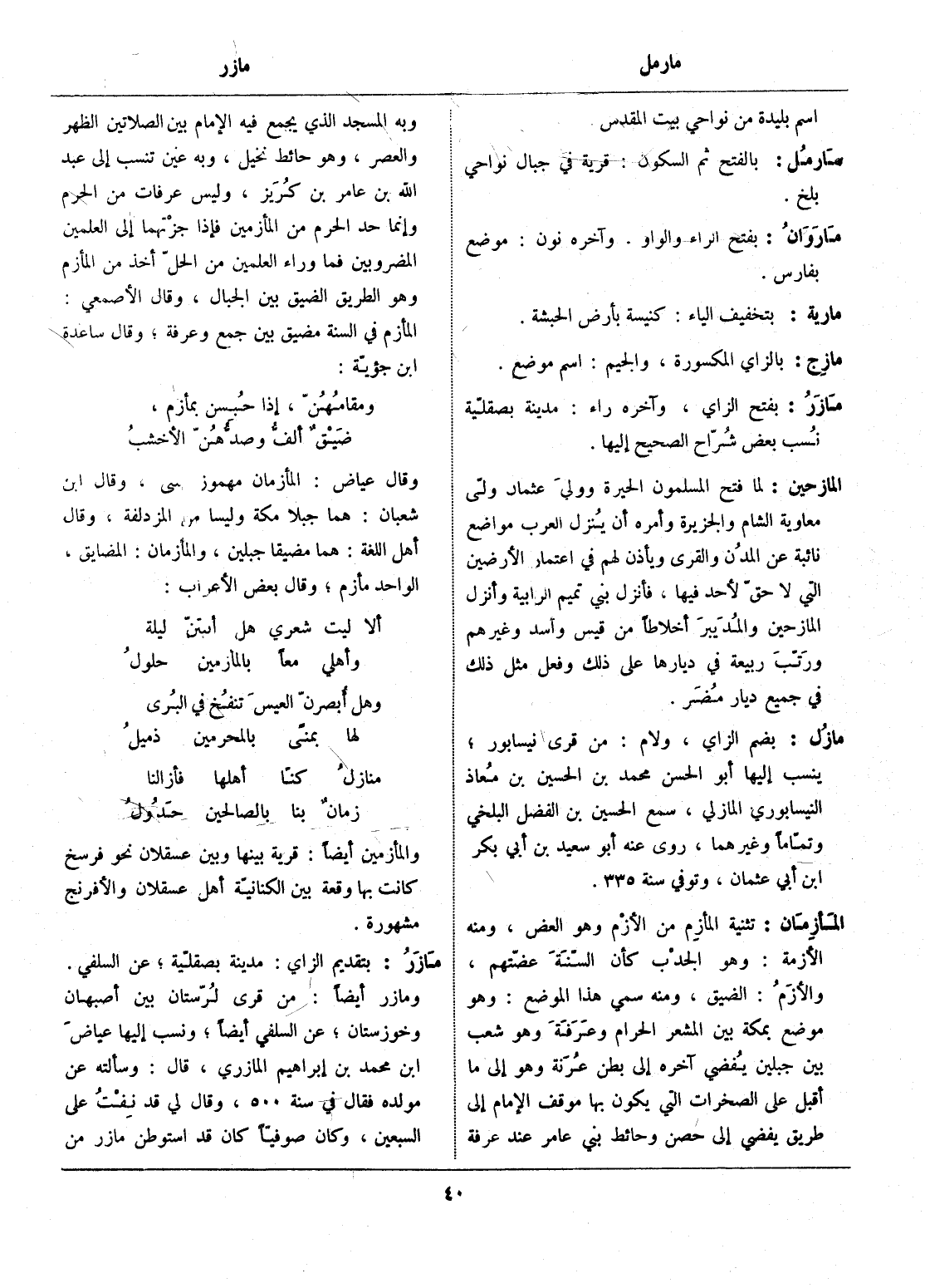 ومازر أيضا: من قرى لرّستان بين أصبهان وخوزستان، عن السلفي أيضا، ونسب إليها عياض ابن محمد بن إبراهيم المازري، قال: وسألته عن مولده فقال في سنة 500، وقال لي قد نفت على السبعين، وكان صوفيّا كان قد استوطن مازر من