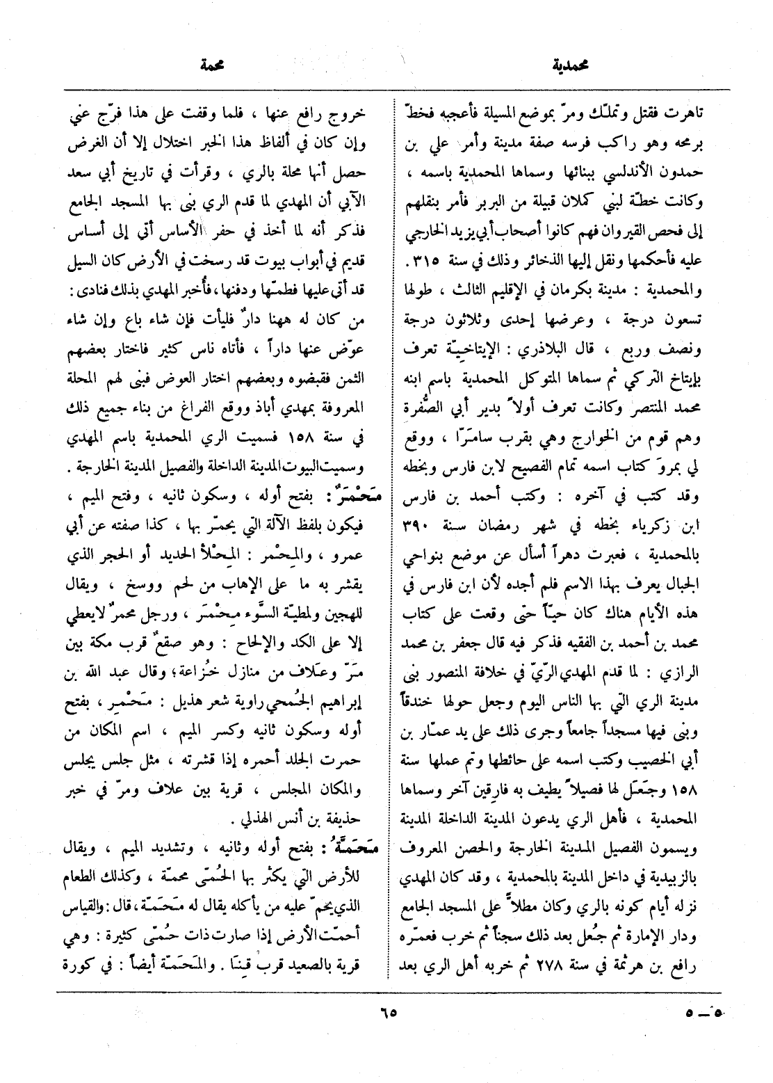 من كان له ههنا دار فليأت فإن شاء باع وإن شاء عوّض عنها دارا، فأتاه ناس كثير فاختار بعضهم الثمن فقبضوه وبعضهم اختار العوض فبنى لهم المحلة المعروفة بمهدي أباذ ووقع الفراغ من بناء جميع ذلك في سنة 158 فسميت الري المحمدية باسم المهدي وسميت البيوت المدينة الداخلة والفصيل المدينة الخارجة.