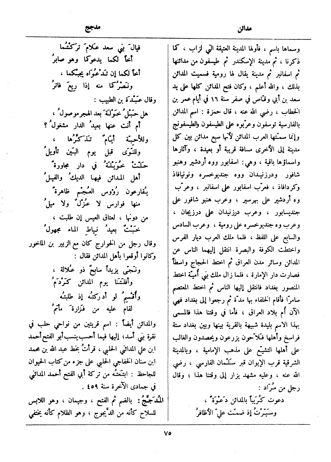 وسماها باسم، فأولها المدينة العتيقة التي لزاب، كما ذكرنا، ثم مدينة الإسكندر ثم طيسفون من مدائنها ثم اسفانبر ثم مدينة يقال لها رومية فسميت المدائن بذلك، والله أعلم، وكان فتح المدائن كلها على يد سعد بن أبي وقّاص في صفر سنة 16 في أيام عمر بن الخطاب، رضي الله عنه، قال حمزة: اسم المدائن بالفارسية توسفون وعرّبوه على الطيسفون والطيسفونج وإنما سمّتها العرب المدائن لأنها سبع مدائن بين كل مدينة إلى الأخرى مسافة قريبة أو بعيدة، وآثارها واسماؤها باقية، وهي: اسفابور ووه أردشير وهنبو شافور ودرزيندان ووه جنديوخسره ونونيافاذ وكردافاذ، فعرّب اسفابور على اسفانبر، وعرّب وه أردشير على بهرسير، وعرب هنبو شافور على جنديسابور، وعرب درزيندان على درزيجان، وعرب وه جنديوخسره على رومية، وعرب السادس والسابع على اللفظ، فلما ملك العرب ديار الفرس واختطت الكوفة والبصرة انتقل إليهما الناس عن المدائن وسائر مدن العراق ثم اختط الحجاج واسطا فصارت دار الإمارة، فلما زال ملك بني أميّة اختط المنصور بغداد فانتقل إليها الناس ثم اختط المعتصم سامرّا فأقام الخلفاء بها مدّة ثم رجعوا إلى بغداد فهي الآن أم بلاد العراق، فأما في وقتنا هذ فالمسمى بهذا الاسم بليدة شبيهة بالقرية بينها وبين بغداد ستة فراسخ وأهلها فلّاحون يزرعون ويحصدون والغالب على أهلها التشيّع على مذهب الإمامية، وبالمدينة الشرقية قرب الإيوان قبر سلمان الفارسي، رضي الله عنه، وعليه مشهد يزار إلى وقتنا هذا، وقال رجل من مراد: