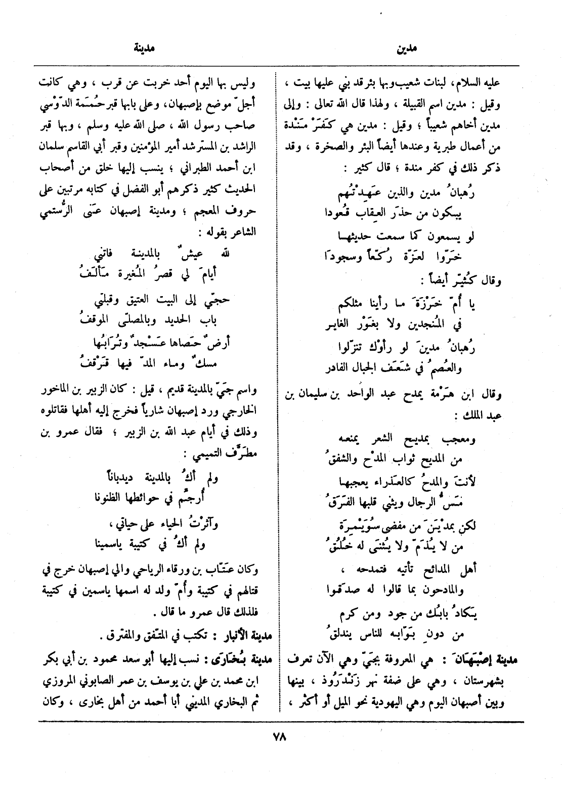 عليه السّلام، لبنات شعيب وبها بئر قد بني عليها بيت، وقيل: مدين اسم القبيلة، ولهذا قال الله تعالى: وإلى مدين أخاهم شعيبا، وقيل: مدين هي كفر مندة من أعمال طبرية وعندها أيضا البئر والصخرة، وقد ذكر ذلك في كفر مندة، قال كثير: