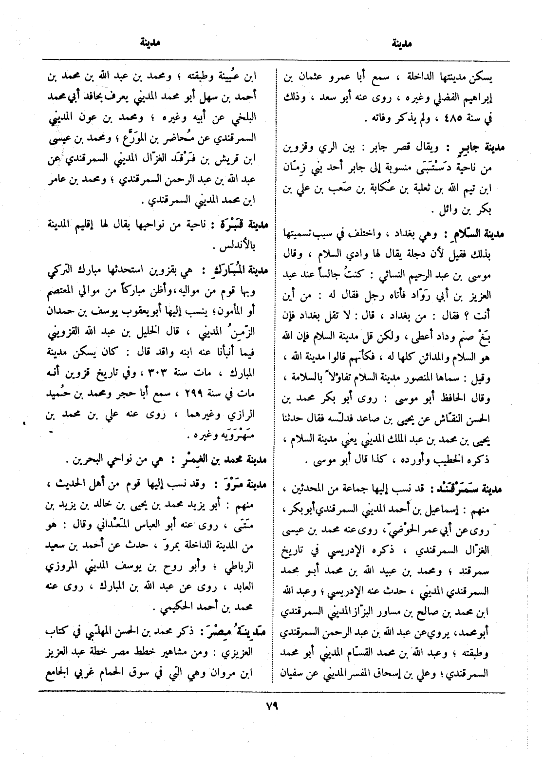 وهي بغداد، واختلف في سبب تسميتها بذلك فقيل لأن دجلة يقال لها وادي السلام، وقال موسى بن عبد الرحيم النسائي: كنت جالسا عند عبد العزيز بن أبي روّاد فأتاه رجل فقال له: من أين أنت؟ فقال: من بغداد، قال: لا تقل بغداد فإن بغ صنم وداد أعطى، ولكن قل مدينة السلام فإن الله هو السلام والمدائن كلها له، فكأنهم قالوا مدينة الله، وقيل: سماها المنصور مدينة السلام تفاؤلا بالسلامة، وقال الحافظ أبو موسى: روى أبو بكر محمد بن الحسن النقّاش عن يحيى بن صاعد فدلّسه فقال حدثنا يحيى بن محمد بن عبد الملك المديني يعني مدينة السلام، ذكره الخطيب وأورده، كذا قال أبو موسى.