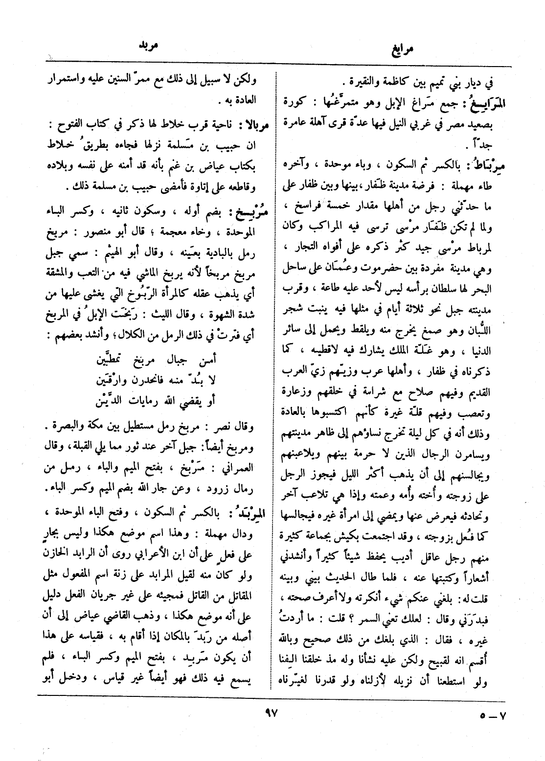 بالكسر ثم السكون، وفتح الباء الموحدة، ودال مهملة: وهذا اسم موضع هكذا وليس بجار على فعل على أن ابن الأعرابي روى أن الرابد الخازن ولو كان منه لقيل المرابد على زنة اسم المفعول مثل المقاتل من القاتل فمجيئه على غير جريان الفعل دليل على أنه موضع هكذا، وذهب القاضي عياض إلى أن أصله من ربد بالمكان إذا أقام به، فقياسه على هذا أن يكون مربد، بفتح الميم وكسر الباء، فلم يسمع فيه ذلك فهو أيضا غير قياس، ودخل أبو 7- 5 معجم البلدان دار صادر