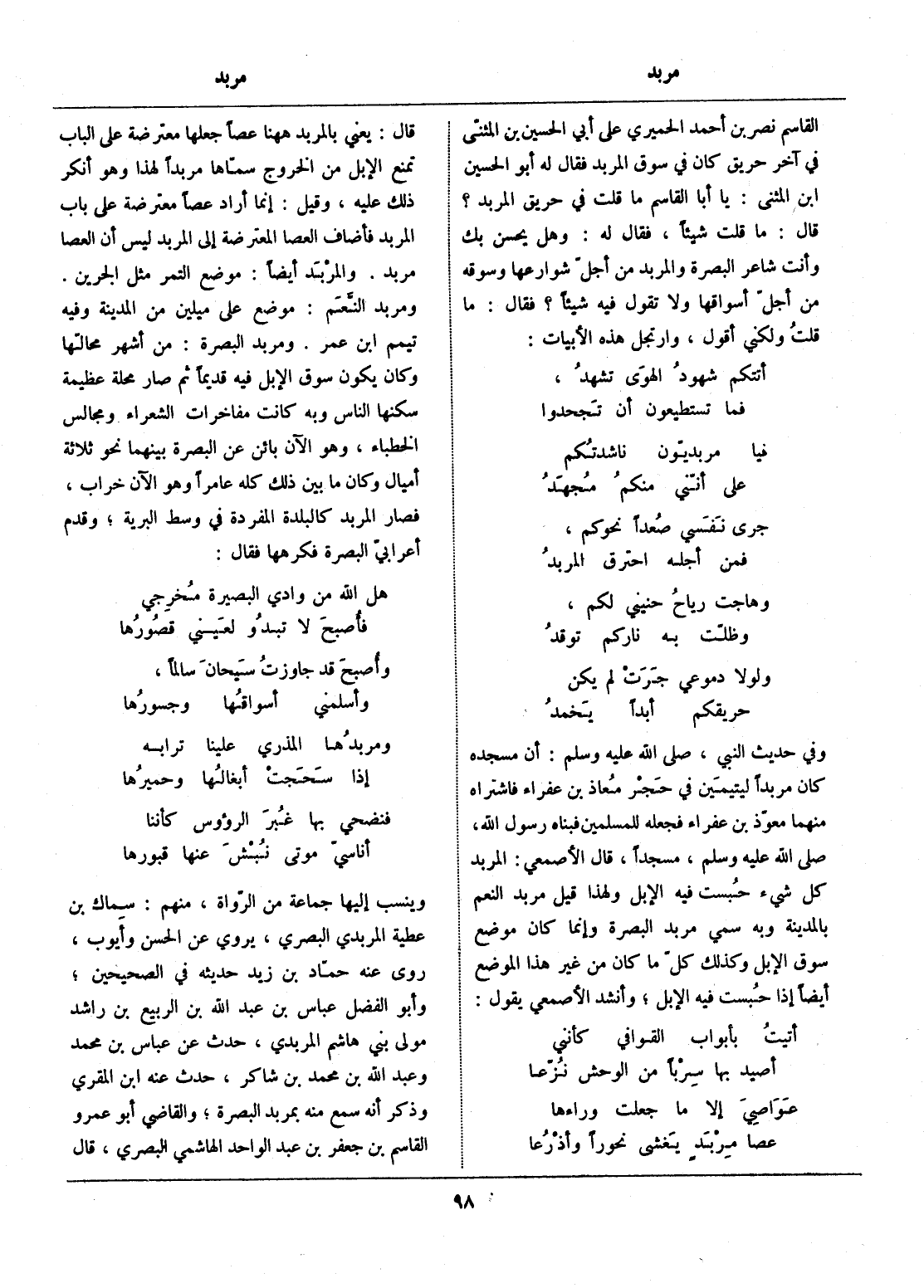 قال: ما قلت شيئا، فقال له: وهل يحسن بك وأنت شاعر البصرة والمربد من أجلّ شوارعها وسوقه من أجلّ أسواقها ولا تقول فيه شيئا؟ فقال: ما قلت ولكني أقول، وارتجل هذه الأبيات: