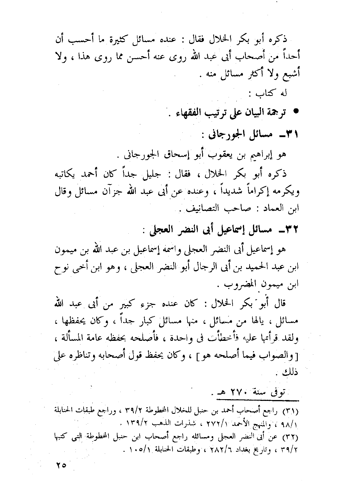 ذكره أَبُو بكر الْخلال فَقَالَ كَانَ أَبُو عبد الله يرفع إِلَيْهِ الشَّيْء فَيَقُول أجعَل كَذَا وَلَا تخلطه وَلَا يَقع هَذَا فِي مَوضِع كَذَا وَكَانَ أَخا دين وورع وَنقل عَن الإِمَام أَحْمد مسَائِل كَثِيرَة سِتَّة عشر جُزْءا وَتُوفِّي سنة 275 هـ