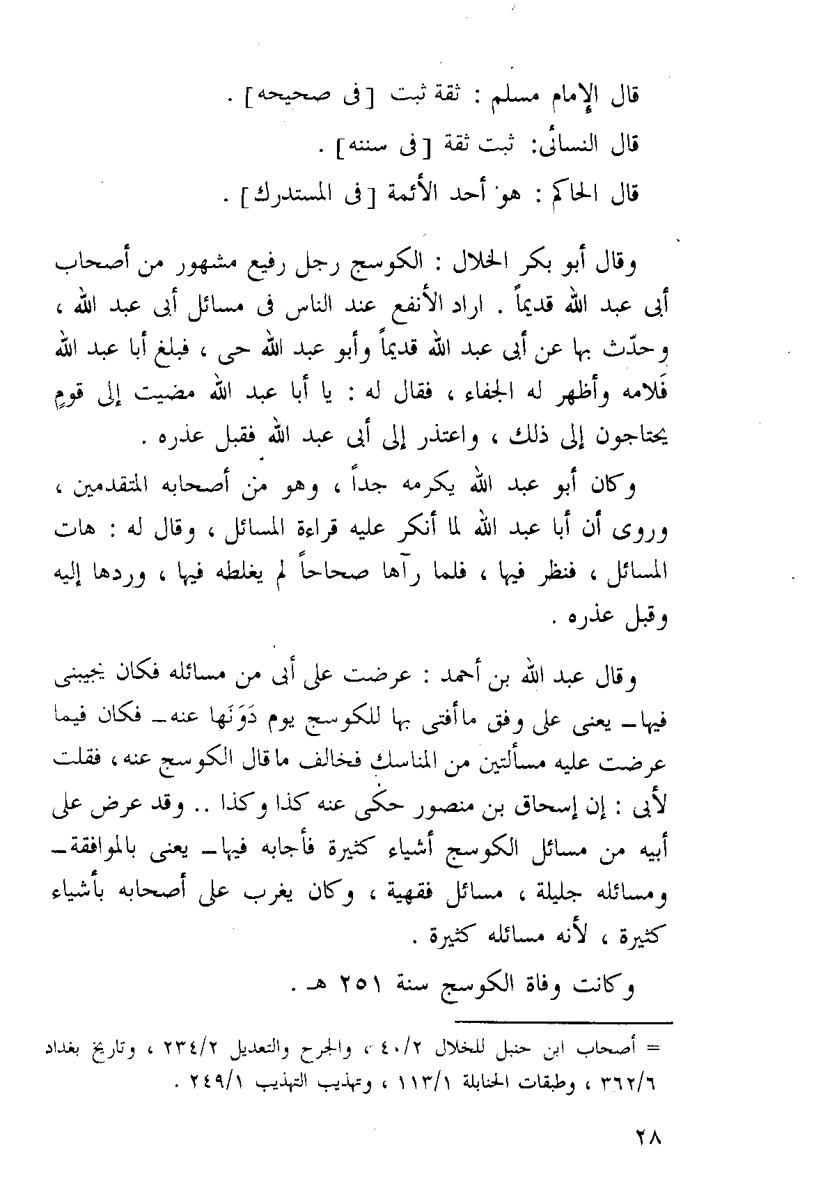 قَالَ أَبُو بكر الْخلال الشَّيْخ الصَّالح كَانَ أَبُو عبد الله يقدمهُ ويكرمه وَكَانَ عِنْده عَن أبي عبد الله جزآن حَدِيث وَقع لَهُ مِنْهَا مسَائِل أَيْضا