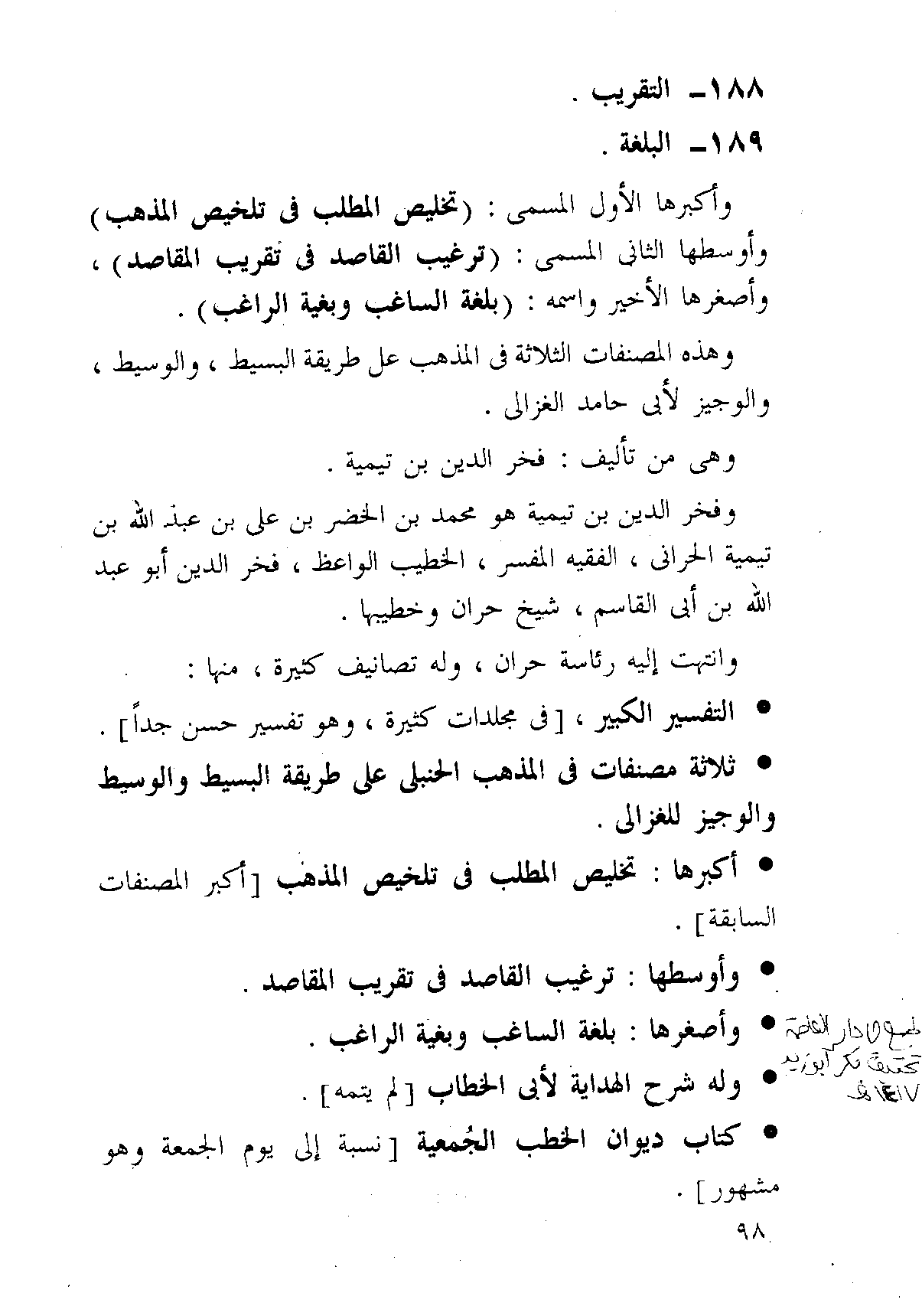 وَهُوَ فِي فقه الْمَذْهَب الْحَنْبَلِيّ كتاب جيد طبع فِي مجلدين صغيرين من تأليف الشَّيْخ الإِمَام شيخ الْإِسْلَام الْمجد أَبُو البركات بن تَيْمِية عبد السَّلَام بن عبد الله بن أبي الْقَاسِم الْحَرَّانِي