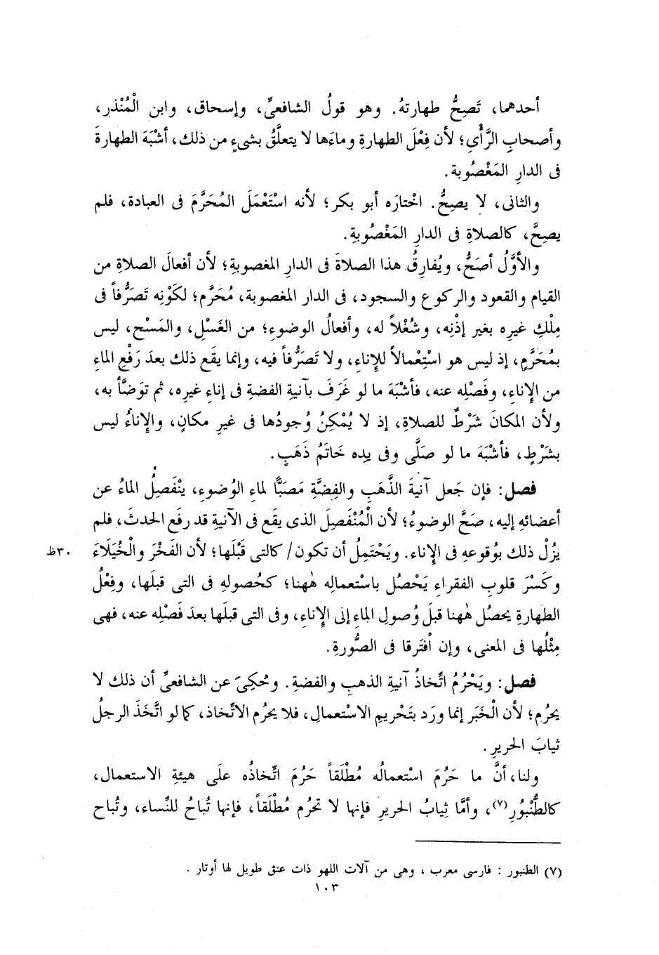 فصل: فإن جَعل آنيةَ الذَّهَبِ والفِضَّةِ مَصَبًّا لماءِ الوُضوءِ، ينْفَصِلُ الماءُ عن أعضائهِ إليه، صَحَّ الوضوءُ؛ لأن الْمُنْفَصِلَ الذي يقَع في الآنيةِ قد رفَع الحدثَ، فلم يزُلْ ذلك بوُقوعهِ في الإِناء. ويَحْتَمِلُ أن تكون كالتى قَبْلَها؛ لأن الفَخْرَ والْخُيَلَاءَ وكَسْرَ قلوبِ الفقراءِ يَحْصُل باسْتعمالِه ههنا؛ كحُصولهِ في التي قبلَها، وفِعْلُ الطهارةِ يحصُل ههنا قبلَ وُصولِ الماءِ إلى الإِناءِ، وفى التي قبلَها بعدَ فَصْلِه عنه، فهى مِثْلُها في المعنى، وإن اْفتَرقا في الصُّورةِ.