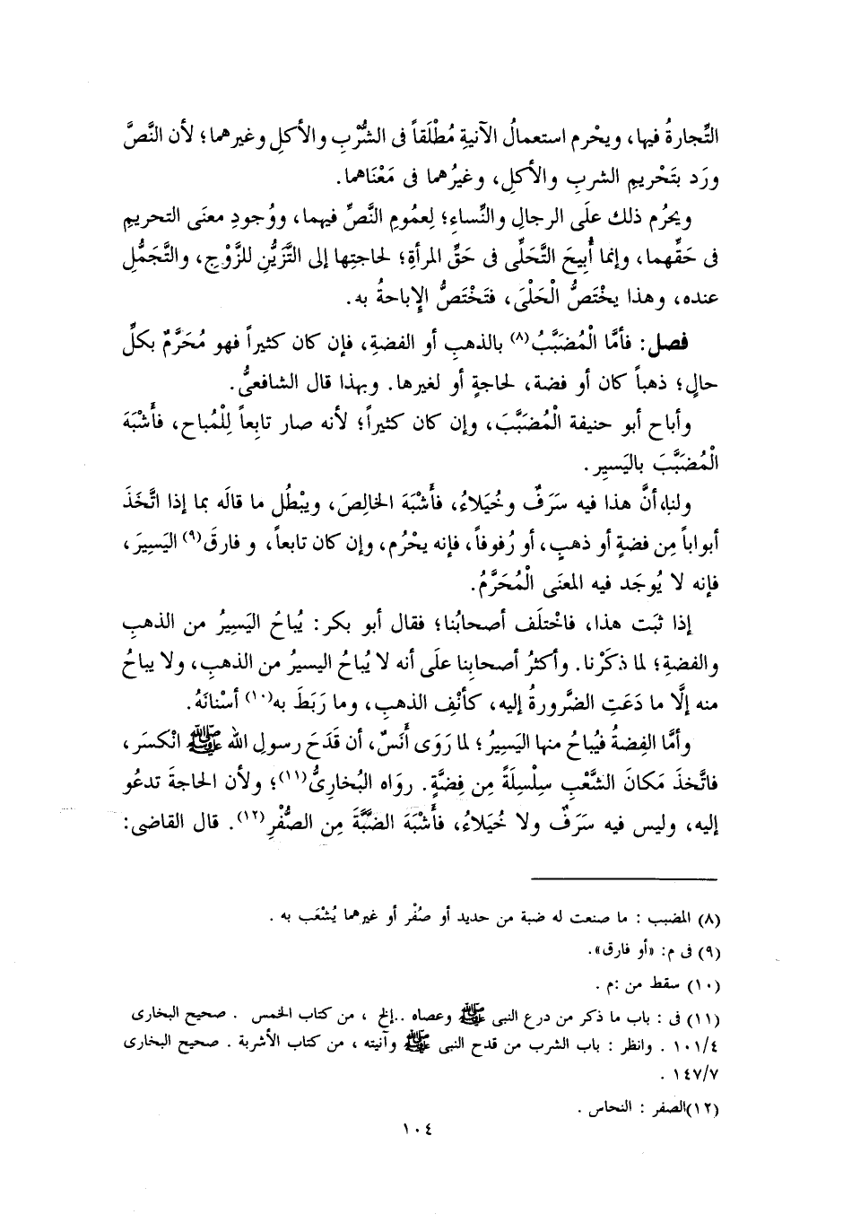 فصل: فأمَّا الْمُضَبَّبُ (٨) بالذهبِ أو الفضةِ، فإن كان كثيرًا فهو مُحَرَّمٌ بكلِّ حالٍ؛ ذهبًا كان أو فضة، لحاجةٍ أو لغيرها. وبهذا قال الشافعيُّ.