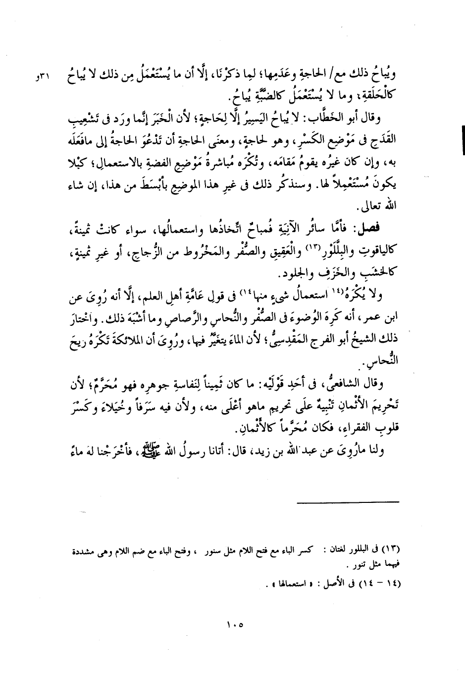 فصل: فأمَّا سائُر الآنِيَةِ فمُباحٌ اتِّخاذُها واستعمالُها، سواء كانتْ ثمينةً، كالياقوتِ والبِلَّلَوْرِ (١٣) والْعَقيقِ والصُّفْر والمَخْرُوط من الزُّجاجِ، أو غيرِ ثمينةٍ، كالخشَبِ والخَزَفِ والجلود.