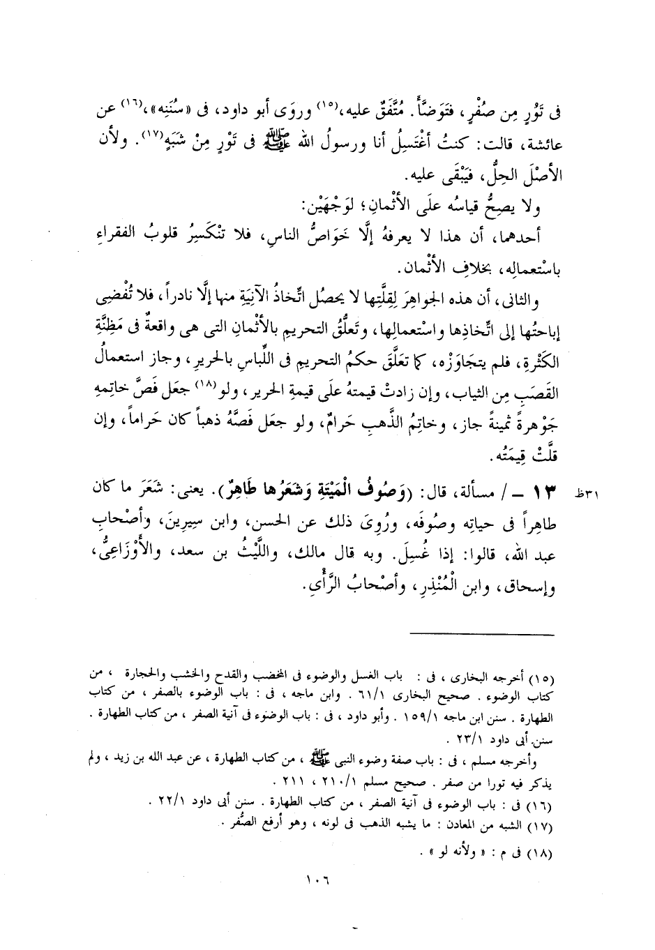 (١٥) أخرجه البخاري، في: باب الغسل والوضوء في المخضب والقدح والخشب والحجارة، من كتاب الوضوء. صحيح البخاري ١/ ٦١. وأبو داود، في: باب الوضوء بالصفر، من كتاب الطهارة. سنن ابن ماجه ١/ ١٥٩. وأبو داود، في: باب الوضوء في آنية الصفر، من كتاب الطهارة. سنن أبي داود ١/ ٢٣.