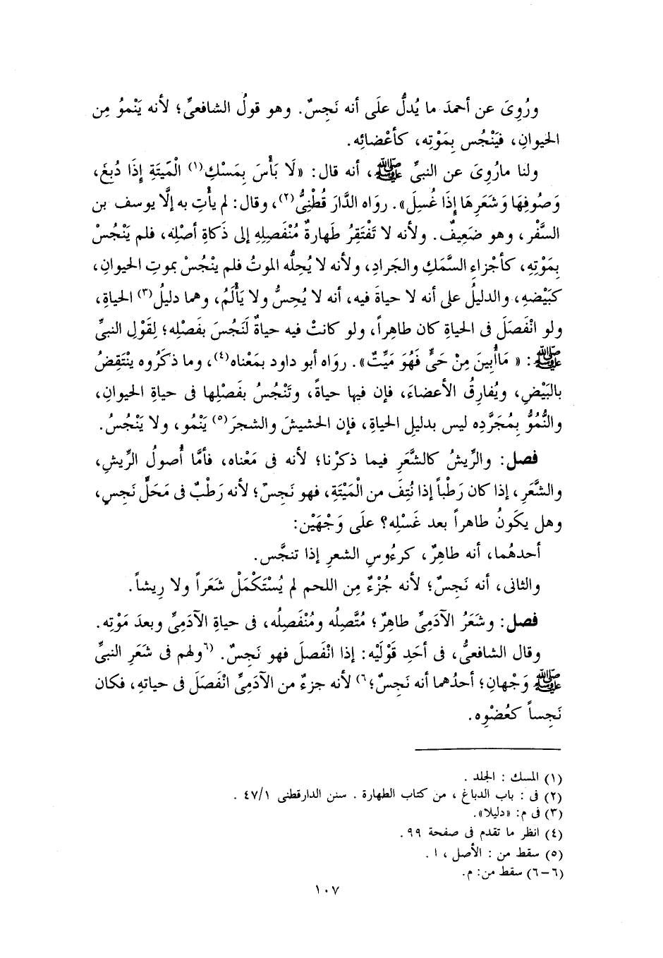 ولنا ما رُوِىَ عن النبيِّ -صلى اللَّه عليه وسلم-، أنه قال: "لَا بَأْسَ بِمَسْكِ (١) الْمَيتَةِ إِذَا دُبِغَ، وَصُوفِهَا وَشَعَرِهَا إِذَا غُسِلَ". روَاه الدَّارَقُطْنِىُّ (٢)، وقال: لم يأْتِ به إلَّا يوسف بن السَّفْر، وهو ضَعِيفٌ. ولأنه لا تَفْتَقِرُ طَهارةٌ مُنْفَصِلِهِ إلى ذَكاةِ أصْلِه، فلم يَنْجُسْ بِمَوْتِهِ، كأجْزاءِ السَّمَكِ والجَرادِ، ولأنه لا يُحِلُّه الموتُ فلم ينْجُسْ بموتِ الحيوانِ، كبَيْضهِ، والدليلُ على أنه لا حياةَ فيه، أنه لا يُحِسُّ ولا يَأْلَمُ، وهما دليلُ (٣) الحياةِ، ولو انْفَصَلَ في الحياةِ كان طاهِرًا، ولو كانتْ فيه حياةٌ لَنَجُسَ بفَصْلِه؛ لِقَوْلِ النبيِّ -صلى اللَّه عليه وسلم-: "مَا أُبِينَ مِنْ حَىٍّ فَهُوَ مَيِّتٌ". روَاه أبو داود بمَعْناه (٤)، وما ذكَرُوه ينْتَقِضُ بالبَيْضِ، ويُفارِقُ الأعضاءَ، فإن فيها حياةً، وتَنْجُسُ بفَصْلِها في حياةِ الحيوانِ، والنُّمُوُّ بِمُجَرَّدِه ليس بدليلِ الحياةِ، فإن الحشيشَ والشجرَ (٥) يَنْمُو، ولا يَنْجُسُ.