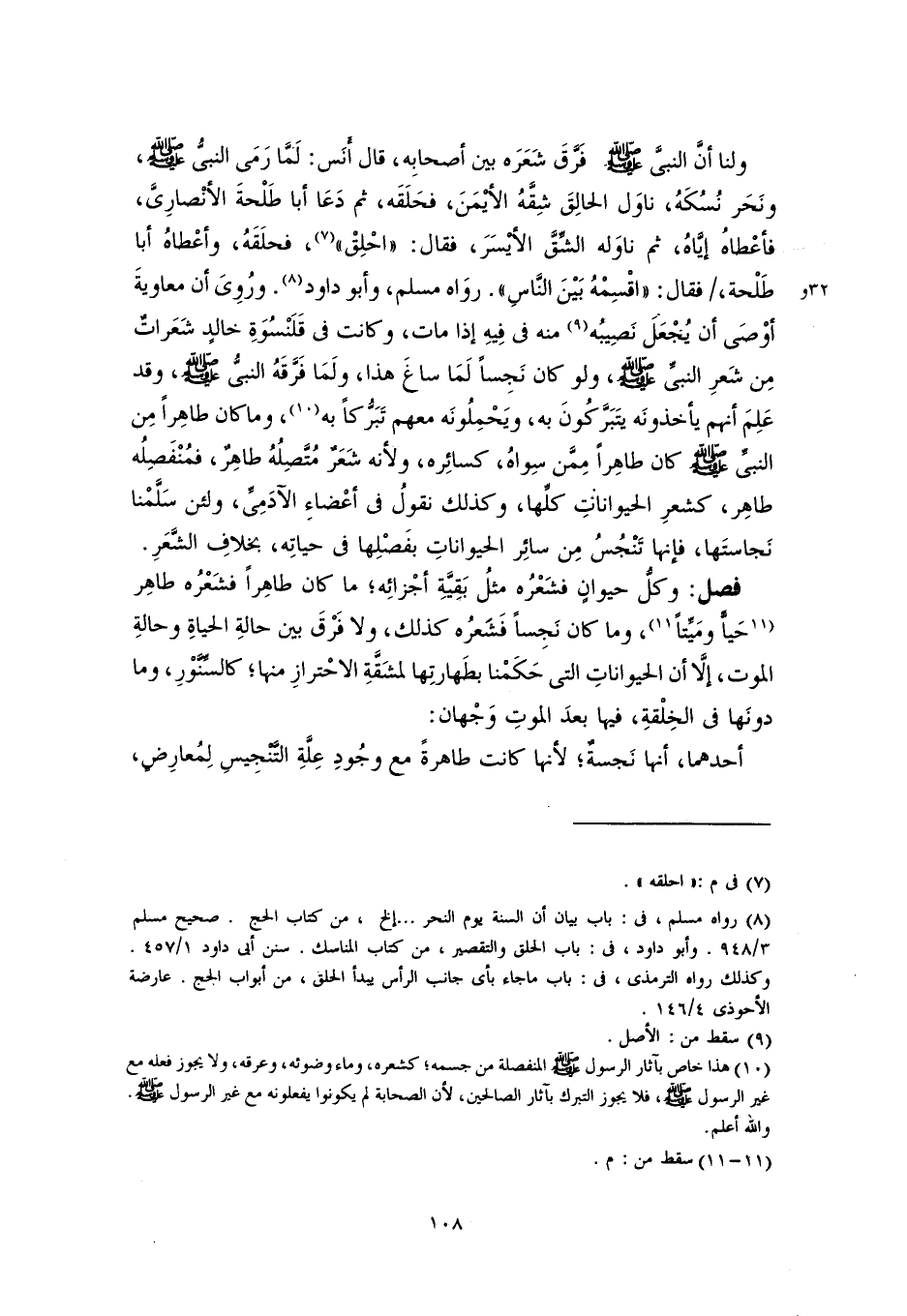 ولنا أنَّ النبيَّ -صلى اللَّه عليه وسلم-. فرَّقَ شَعَرَه بين أصحابِه، قال أَنَس: لَمَّا رَمَى النبيُّ -صلى اللَّه عليه وسلم-، ونَحَر نُسُكَهُ، ناوَل الحالِقَ شِقَّهُ الأيْمَنَ، فحَلَقَه، ثم دَعَا أبا طَلْحةَ الأنْصارِيَّ، فأعْطاهُ إيَّاهُ، ثم ناوَله الشِّقَّ الأيْسَرَ، فقال: "احْلِقْ" (٧)، فحلَقَهُ، وأعْطاهُ أبا طَلْحة، فقال: "اقْسِمْهُ بَيْنَ النَّاسِ". روَاه مسلم، وأبو داود (٨). ورُوِىَ أن معاويةَ أوْصَى أن يُجْعَلَ نَصِيبُه (٩) منه في فِيهِ إذا مات، وكانت في قَلَنْسُوَةِ خالدٍ شَعَراتٌ مِن شَعرِ النبيِّ -صلى اللَّه عليه وسلم-، ولو كان نَجِسًا لَمَا ساغَ هذا، ولَمَا فَرَّقَهُ النبيُّ -صلى اللَّه عليه وسلم-، وقد عَلِمَ أنهم يأخذونَه يتَبَرَّكُونَ به، ويَحْمِلُونَه معهم تَبَرُّكًا به (١٠)، وما كان طاهِرًا مِن النبيِّ -صلى اللَّه عليه وسلم- كان طاهِرًا مِمَّن سِواهُ، كسائِره، ولأنه شَعَرٌ مُتَّصِلُهُ طاهِرٌ، فمُنْفَصِلُه طاهِر، كشعرِ الحيواناتِ كلِّها، وكذلك نقولُ في أعْضاءِ الآدَمِىِّ، ولئن سَلَّمْنا نَجاستَها، فإنها تَنْجُسُ مِن سائِر الحيواناتِ بفَصْلِها في حياتِه، بخلافِ الشَّعَرِ.