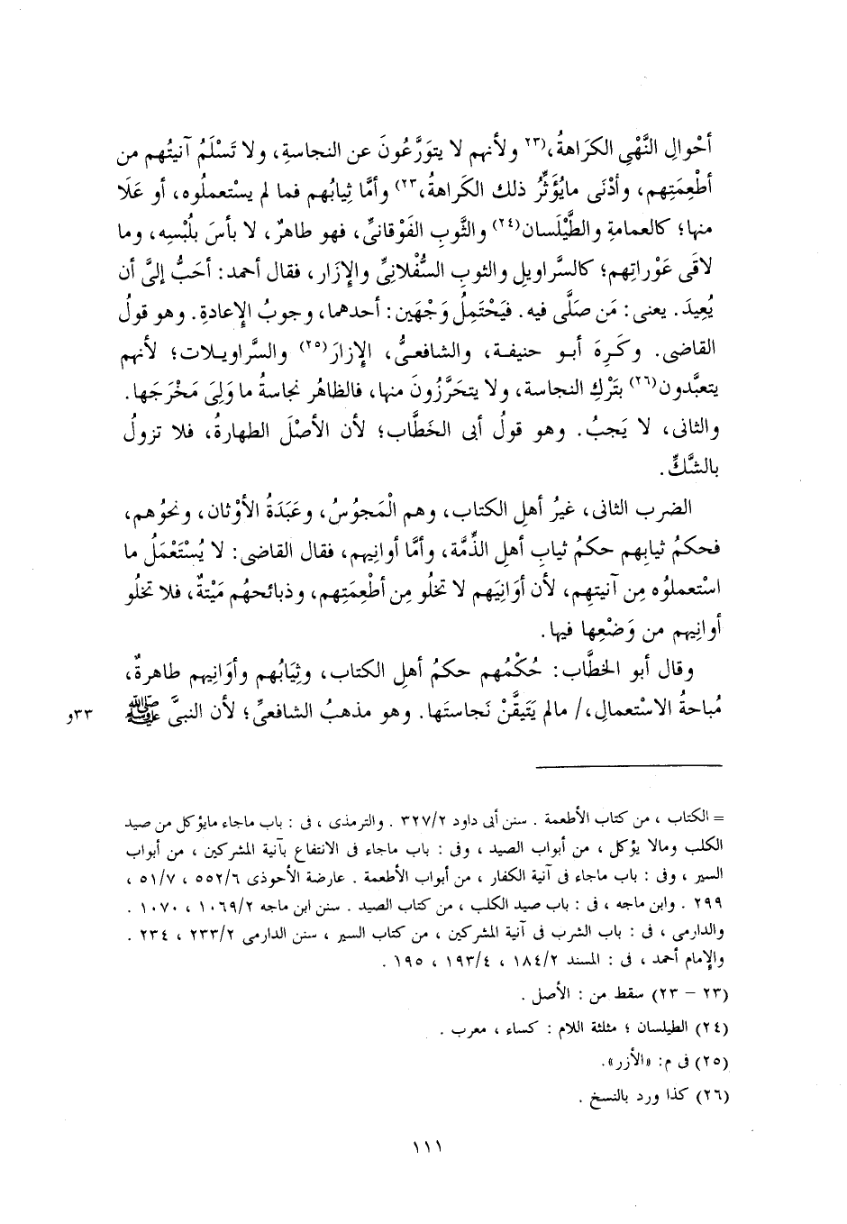 أحْوالِ النَّهْىِ الكرَاهةُ، [ولأنهم لا يتوَرَّعُونَ عن النجاسةِ، ولا تَسْلَمُ آنيتُهم من أطْعِمَتِهم، وأدْنَى ما يُؤَثِّرُ ذلك الكَراهةُ، ] (٢٣) وأمَّا ثِيابُهم فما لم يسْتعملُوه، أو عَلَا منها؛ كالعمامةِ والطَّيْلَسان (٢٤) والثَّوبِ الفَوْقانىِّ، فهو طاهرٌ، لا بأسَ بلُبْسِه، وما لاقَى عَوْراتِهم؛ كالسَّراويلِ والثوبِ السُّفْلانِىِّ والإِزَار، فقال أحمد: أحَبُّ إلىَّ أن يُعِيدَ. يعني: مَنْ صَلَّى فيه. فيَحْتَمِلُ وَجْهَين: أحدهما، وجوبُ الإِعادةِ. وهو قولُ القاضي. وكَرِهَ أبو حنيفة، والشافعيُّ، الإِزارَ (٢٥) والسَّراويلات؛ لأنهم يتعبَّدون (٢٦) بتَرْكِ النَّجاسة، ولا يتحَرَّزُونَ منها، فالظاهُر نجاسةُ ما وَلِىَ مَخْرَجَها. والثانى، لا يَجبُ. وهو قولُ أبى الخَطَّاب؛ لأن الأصْلَ الطهارةُ، فلا تزولُ بالشَّكِّ.