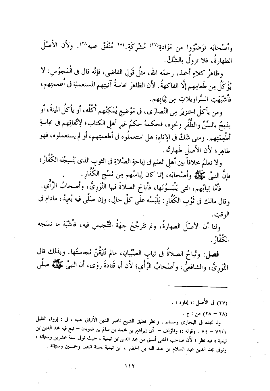 ولم نجده في البخاري ومسلم. وانظر تعليق الشيخ ناصر الدين الألباني عليه، في: إرواء الغليل ١/ ٧٢ - ٧٤. وقوله: "والمؤلف - أي إبراهيم بن محمد بن سالم بن ضويان - تبع فيه مجد الدين ابن تيمية" فيه نظر؛ لأن صاحب المغنى أسبق من مجد الدين ابن تيمية، حيث توفى سنة عشرين وستمائة، وتوفي مجد الدين عبد السلام بن عبد اللَّه بن الخضر، ابن تيمية، سنة اثنتين وخمسين وستمائة.