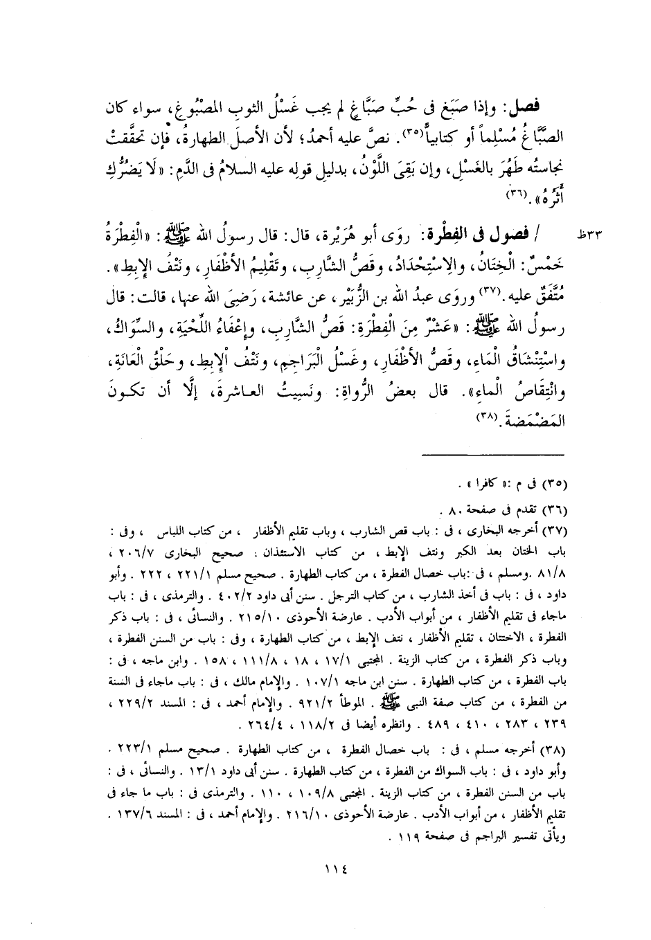 فصول في الفِطْرة: روَى أبو هُرَيْرة، قال: قال رسولُ اللَّه -صلى اللَّه عليه وسلم-: "الْفِطْرَةُ خَمْسٌ: الْخِتَانُ، والِاسْتِحْدَادُ، وقَصُّ الشَّارِبِ، وتَقْلِيمُ الأظْفَارِ، ونَتْفُ الإِبِطِ". مُتَّفَقٌ عليه. (٣٧) وروَى عبدُ اللَّه بن الزُّبَيْر، عن عائشة، رَضِىَ اللَّه عنها، قالت: قال رسولُ اللَّه -صلى اللَّه عليه وسلم-: "عَشْرٌ مِنَ الْفِطْرَةِ: قَصُّ الشَّارِبِ، وإِعْفَاءُ اللِّحْيَةِ، والسِّوَاكُ، واسْتِنْشَاقُ الْمَاءِ، وقَصُّ الأظْفَارِ، وغَسْلُ الْبَرَاجِمِ، ونَتْفُ اْلإِبِطِ، وحَلْقُ الْعَانَةِ، وانْتِقَاصُ الْماءِ". قال بعضُ الرُّواةِ: ونَسِيتُ العاشرةَ، إلَّا أن تكونَ المَضْمَضةَ. (٣٨)