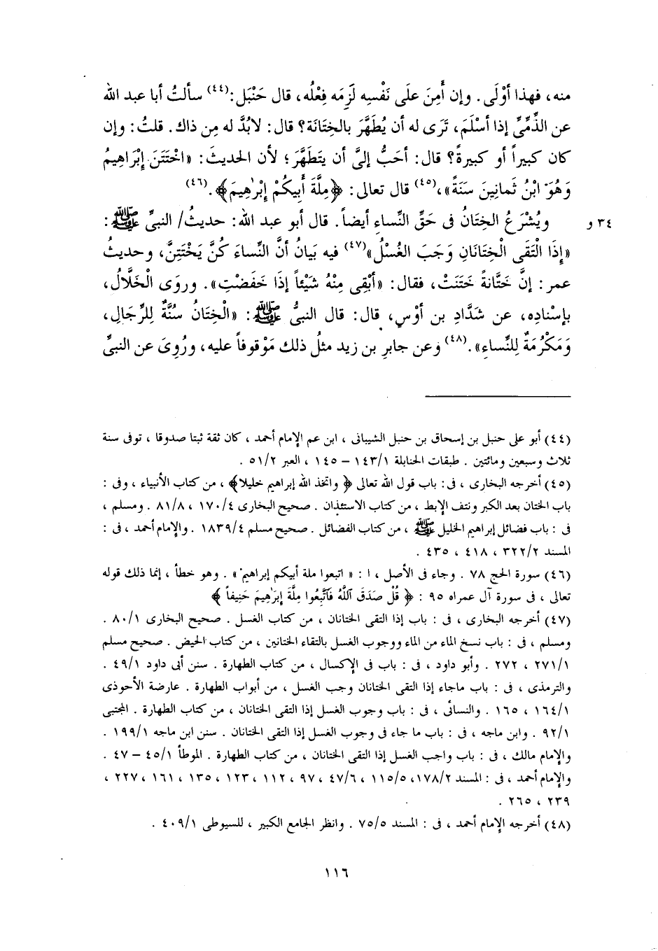 (٤٧) أخرجه البخاري، في: باب إذا التقى الختانان، من كتاب الغسل. صحيح البخاري ١/ ٨٠. ومسلم، في: باب نسخ الماء من الماء ووجوب الغسل بالتقاء الختانين، من كتاب الحيض. صحيح مسلم ١/ ٢٧١، ٢٧٢. وأبو داود، في: باب في الإكسال، من كتاب الطهارة. سنن أبي داود ١/ ٤٩. والترمذي، في: باب ما جاء إذا التقى الختانان وجب الغسل، من أبواب الطهارة. عارضة الأحوذى ١/ ١٦٤، ١٦٥. والنسائي، في: باب وجوب الغسل إذا التقى الختانان، من كتاب الطهارة. المجتبى ١/ ٩٢. وابن ماجه، في: باب ما جاء في وجوب الغسل إذا التقى الختانان. سنن ابن ماجه ١/ ١٩٩. والإمام مالك، في: باب واجب الغسل إذا التقى الختانان، من كتاب الطهارة. الموطأ ١/ ٤٥ - ٤٧. والإمام أحمد، في: المسند ٢/ ١٧٨, ٥/ ١١٥، ٦/ ٤٧، ٩٧، ١١٢، ١٢٣، ١٣٥، ١٦١، ٢٢٧، ٢٣٩، ٢٦٥.
