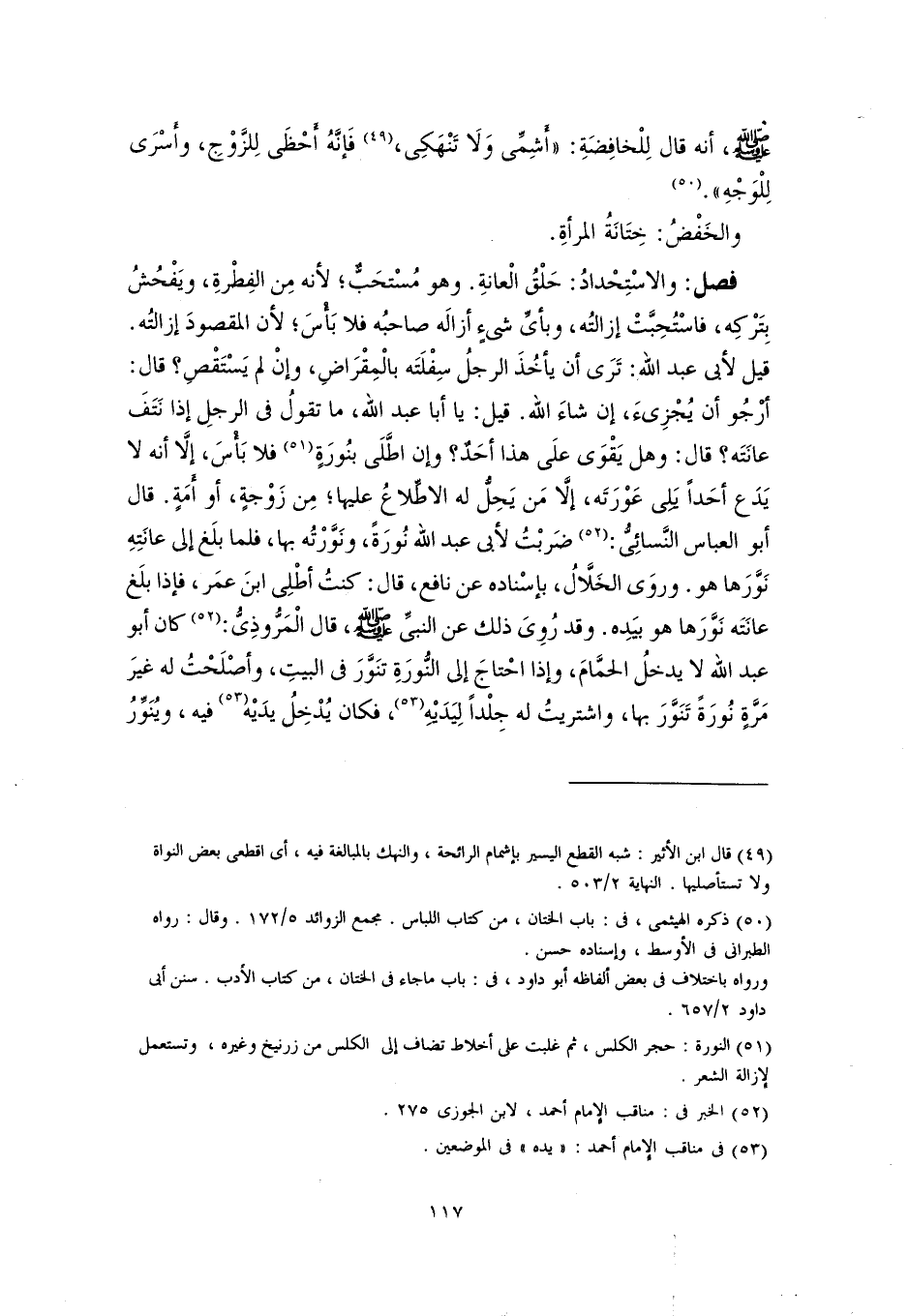 -صلى اللَّه عليه وسلم-، أنه قال لِلْخافِضَةِ: "أَشِمِّى وَلَا تَنْهَكِى، (٤٩) فَإنَّهُ أَحْظَى لِلزَّوْجِ، وأَسْرَى لِلْوَجْهِ". (٥٠)