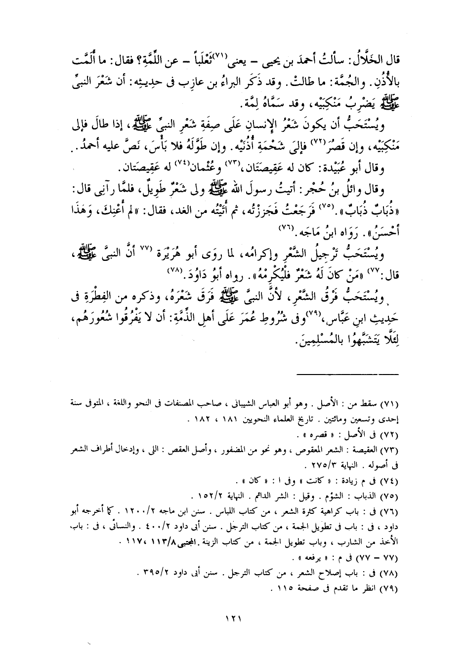 قال الخَلَّالُ: سألتُ أحمدَ بن يحيى - يعني (٧١) ثَعْلَبًا - عن اللِّمَّةِ؟ فقال: ما أَلَمَّت بالأُذُنِ. والجُمَّة: ما طالتْ. وقد ذَكَر البراءُ بن عازِب في حدِيثِه: أن شَعْرَ النبيِّ -صلى اللَّه عليه وسلم- يَضْرِبُ مَنْكِبَيْه، وقد سَمَّاهُ لِمَّة.