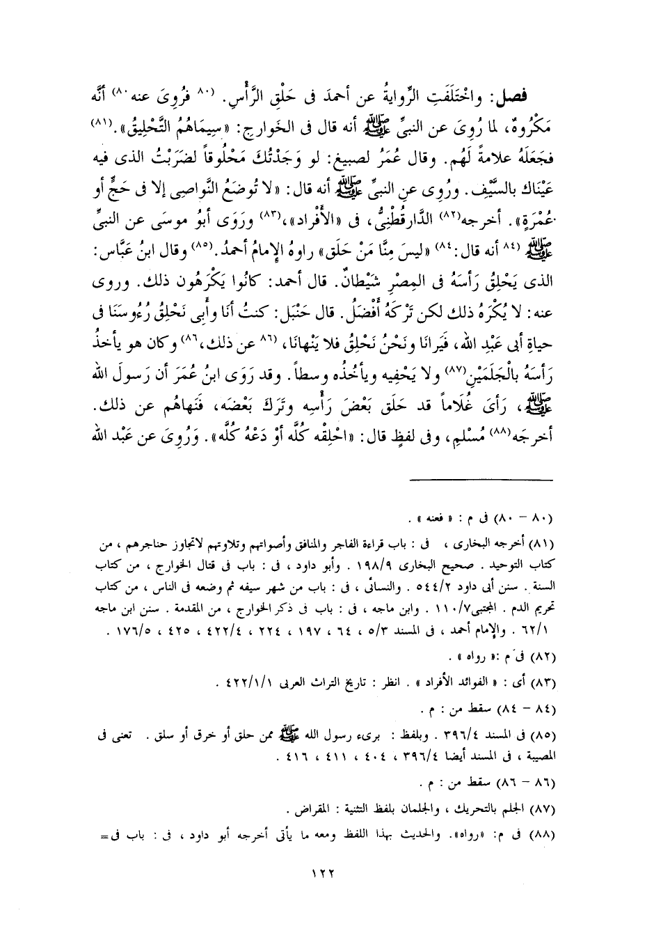 فصل: واخْتَلَفَتِ الرِّوايةُ عن أحمدَ في حَلْقِ الرَّأْسِ. [فرُوِىَ عنه] (٨٠) أنَّه مَكْرُوهٌ، لما رُوِىَ عن النبيِّ -صلى اللَّه عليه وسلم- أنه قال في الخَوارجِ: "سِيمَاهُمُ التَّحْلِيقُ". (٨١) فجَعَلَهُ علامةً لَهُم. وقال عُمَرُ لصبيغ: لو وَجَدْتُكَ مَحْلُوقًا لضَرَبْتُ الذي فيه عَيْنَاك بالسَّيْفِ. ورُوِى عنِ النبيِّ -صلى اللَّه عليه وسلم- أنه قال: "لا تُوضَعُ النَّواصِى إلَّا في حَجٍّ أو عُمْرَةٍ". أخرجه (٨٢) الدَّارقُطْنِىُّ، في "الأَفْراد"، (٨٣) ورَوَى أبُو موسَى عن النبيِّ -صلى اللَّه عليه وسلم-[أنه قال: ] (٨٤) "ليسَ مِنَّا مَنْ حَلَق" رواهُ الإِمامُ أحمدُ. (٨٥) وقال ابنُ عَبَّاس: الذي يَحْلِقُ رَأسَهُ في المِصْرِ شَيْطانٌ. قال أحمد: كانُوا يَكْرَهُون ذلك. وروى عنه: لا يُكْرَهُ ذلك لكن تَرْكَهُ أَفْضَلُ. قال حَنْبَل: كنتُ أنَا وأَبِى نَحْلِقُ رُءُوسَنَا في حياةِ أبي عَبْدِ اللَّه، فَيَرانَا ونَحْنُ نَحْلِقُ فلا يَنْهانَا، [عن ذلك] (٨٦) , وكان هو يأخذُ رَأسَهُ بالْجَلَمَيْنِ (٨٧) ولا يَحْفِيه ويأخُذُه وسطًا. وقد رَوَى ابنُ عُمَرَ أن رَسولَ اللَّه -صلى اللَّه عليه وسلم-، رَأَى غُلَامًا قد حَلَق بَعْضَ رَأْسِه وتَرَكَ بَعْضَه، فَنَهاهُم عن ذلك. أخرجَه (٨٨) مُسْلمِ، وفى لفظٍ قال: "احْلِقْه كُلَّه أوْ دَعْهُ كُلَّه". وَرُوِىَ عن عَبْد اللَّه