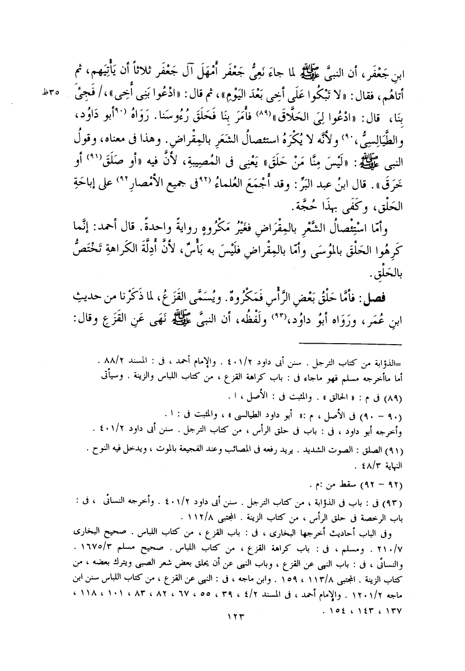 ابنِ جَعْفَر، أن النبيَّ -صلى اللَّه عليه وسلم- لما جاءَ نَعِىُّ جَعْفَر أَمْهَلَ آل جَعْفَر ثلاثًا أن يَأْتِيَهم، ثم أتاهُم، فقال: "لا تَبْكُوا عَلَى أخِى بَعْدَ اليَوْمِ"، ثم قال: "ادْعُوا بَنِى أَخِى"، فَجِئَ بِنَا، قال: "ادْعُوا لِىَ الحَلَّاقَ" (٨٩) فأَمَرَ بِنَا فَحَلَقَ رُءُوسَنا. رَوَاهُ [أبو دَاوُد، والطَّيَالِسِيُّ، ] (٩٠) ولأنَّه لا يُكْرَهُ استئصالُ الشَعَرِ بالمِقْراضِ. وهذا في معناه، وقولُ النبي -صلى اللَّه عليه وسلم-: "لَيْسَ مِنَّا مَنْ حَلَقَ" يَعْنِى في المُصِيبةِ، لأنَّ فيه "أو صَلَقَ (٩١) أو خَرَقَ". قال ابنُ عبد البَرِّ: وقد أَجْمَعَ العُلماءُ [في جميع الأمْصارِ] (٩٢) على إباحَةِ الحَلْق، وكَفَى بهذَا حُجَّة.