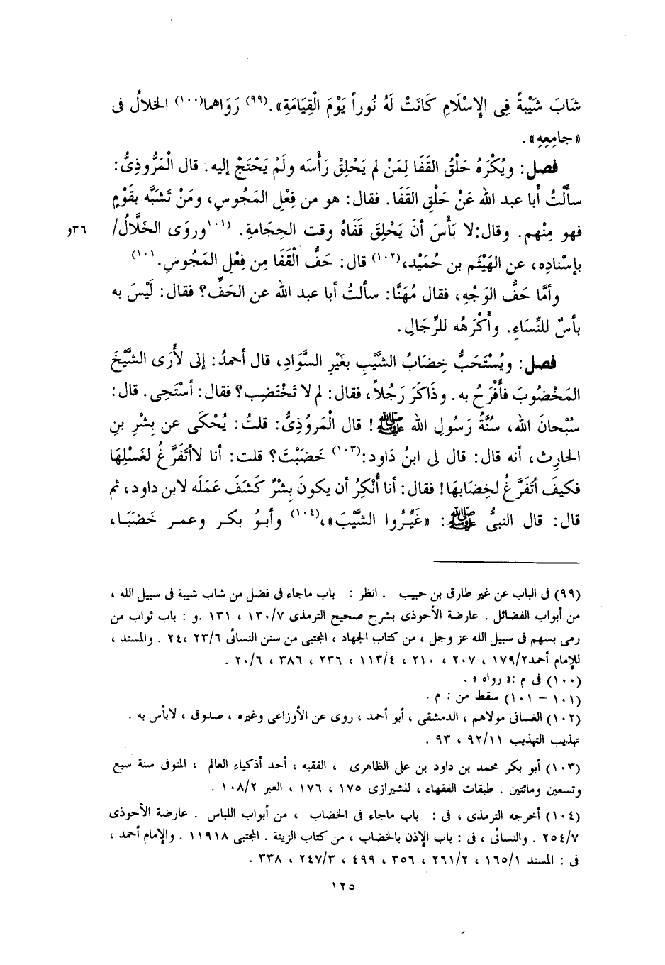 فصل: ويُسْتَحَبُّ خِضَابُ الشَّيْبِ بغَيْرِ السَّوَادِ، قال أحمدُ: إني لأَرَى الشَّيْخَ المَخْضُوبَ فأَفْرَحُ به. وذَاكَرَ رَجُلًا، فقال: لم لا تَخْتَضِب؟ فقال: أسْتَحِى. قال: سُبْحانَ اللَّه، سُنَّةُ رَسُولِ اللَّه -صلى اللَّه عليه وسلم-! قال الْمَرُوذِىُّ: قلتُ: يُحْكَى عن بِشْرِ بنِ الحارِث، أنه قال: قال لي ابنُ دَاود: (١٠٣) خَضَبْتَ؟ قلت: أنا لا أتَفَرَّغُ لغَسْلِهَا فكيفَ أتَفَرَّغُ لخِضَابهَا! فقال: أنا أُنْكِرُ أن يكونَ بِشْرٌ كَشَفَ عَمَلَه لابن داود، ثم قال: قال النبيُّ -صلى اللَّه عليه وسلم-: "غَيِّرُوا الشَّيْبَ"، (١٠٤) وأبُو بكر وعمر خَضَبَا،