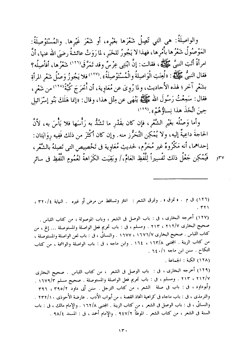 (١٢٧) أخرجه البخاري، في: باب الوصل في الشعر، وباب الموصولة، من كتاب اللباس. صحيح البخاري ٧/ ٢١٢، ٢١٣. ومسلم، في: باب تحريم فعل الواصلة والمستوصلة. . . إلخ، من كتاب اللباس. صحيح البخاري ٧/ ١٦٧٦، ١٦٧٧. والنسائى، في: باب لعن الواصلة والمستوصلة، من كتاب الزينة. المجتبى ٨/ ١٦٣، ١٦٤. وابن ماجه، في: باب الواصلة والواشمة، من كتاب النكاح. سنن ابن ماجه ١/ ٦٤٠.