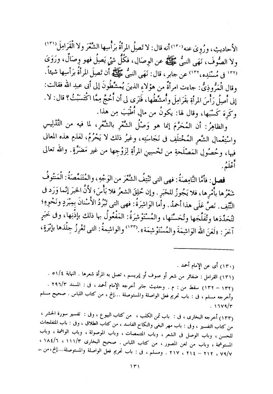 الأحاديثِ، ورُوِىَ عنه (١٣٠) أنه قال: لا تَصِلُ المرأةُ برَأْسِها الشَّعْرَ ولا الْقَرَامِلَ (١٣١) ولا الصُّوفَ، نَهَى النبيُّ -صلى اللَّه عليه وسلم- عن الوِصَالِ، فكُلُّ شيءٍ يَصِلُ فهو وِصَالٌ، ورَوَى [في مُسْنَدِه] (١٣٢) , عن جابر، قال: نَهَى النبيُّ -صلى اللَّه عليه وسلم- أن تَصِلَ المرأةُ برَأسِها شيئًا. وقال الْمَرُّوذِىُّ: جاءت امرأةٌ من هؤلاءِ الذينَ يُمشِّطُونَ إلى أبي عبدِ اللَّه فقالت: إني أَصِلُ رَأْسَ المرأةِ بقَرَامِلَ وأُمشِّطُها، فَتَرَى لي أن أَحُجَّ مِمَّا اكْتَسَبْتُ؟ قال: لا. وكَرِهَ كَسْبَها، وقال لها: يكونُ من مالٍ أَطْيَبَ مِن هذا.
