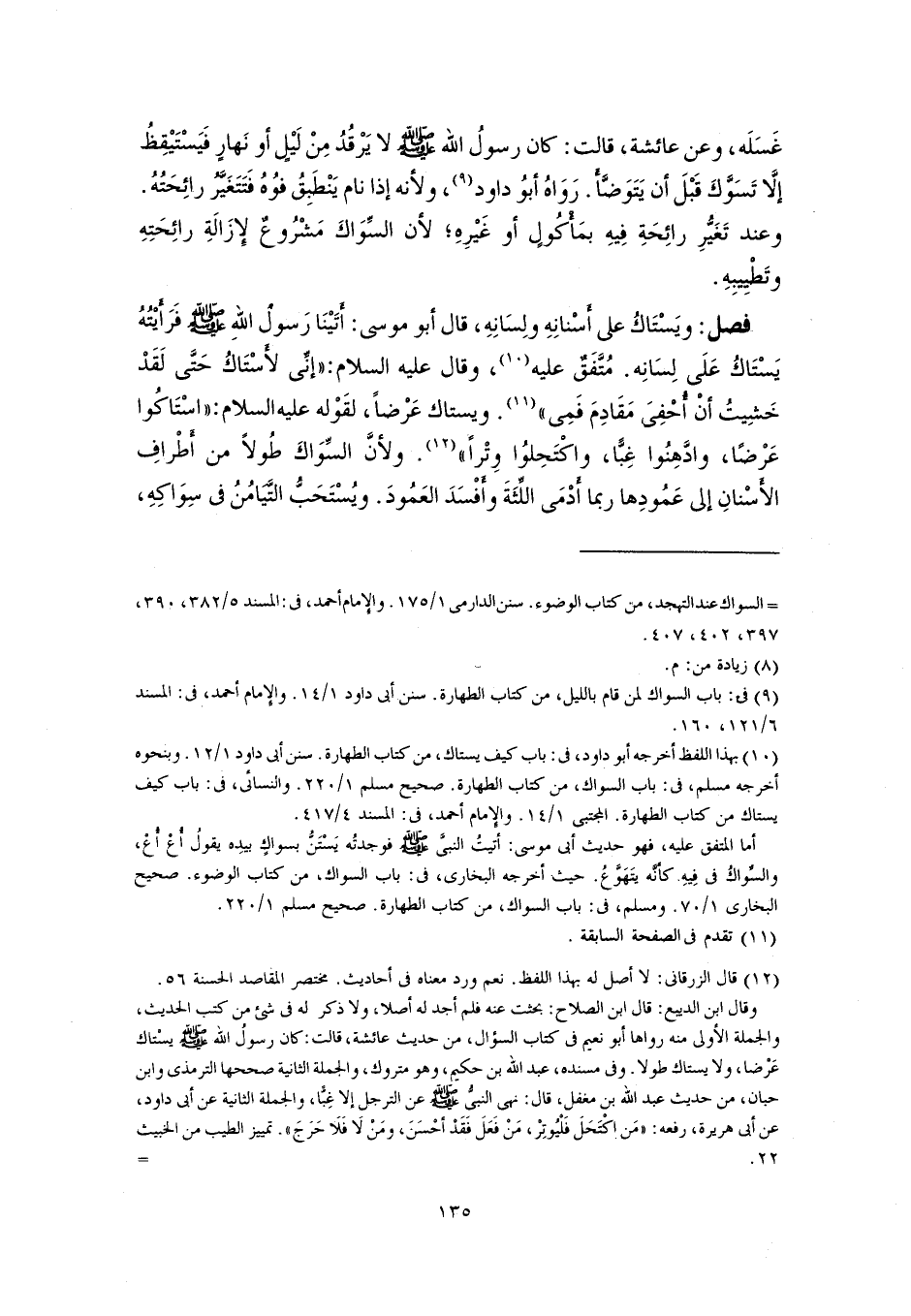 (١٠) بهذا اللفظ أخرجه أبو داود، في: باب كيف يستاك، من كتاب الطهارة. سنن أبي داود ١/ ١٢. وبنحوه أخرجه مسلم، في: باب السواك، من كتاب الطهارة. صحيح مسلم ١/ ٢٢٠. والنسائي، في: باب كيف يستاك من كتاب الطهارة. المجتبى ١/ ١٤. والإمام أحمد، في: المسند ٤/ ٤١٧.