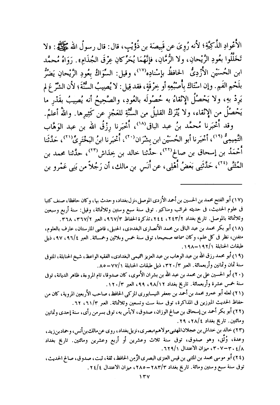 وقد أَخْبَرنا مُحمَّد بنُ عبد الباقى (١٨)، أَخْبَرنا رِزْقُ اللَّه بن عبد الوَهَّاب التَّمِيمِىُّ (١٩)، أخْبَرنا أبو الحُسَيْن ابن بِشْرَان (٢٠). أَخْبَرنا ابنُ البَخْتَرِىِّ (٢١)، حَدَّثَنا أَحْمَدُ بن إسحاق بن صالح (٢٢)، حدَّثنا خالد بن خِدَاش (٢٣)، حدَّثنا محمد بن المُثَنَّى (٢٤)، حَدَّثَنِى بَعضُ أَهْلِى، عن أَنَسِ بنِ مالك، أن رَجُلًا من بَنِى عَمْرو بن