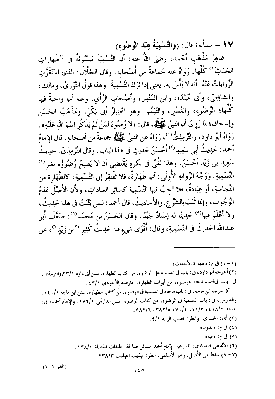 ظاهِرُ مَذْهَبِ أحْمد، رضىَ اللهُ عنه: أن التَّسْمِيَةَ مَسْنُونَةٌ في [طَهاراتِ الحَدَثِ] (١) كُلِّها. رَوَاهُ عنه جَماعةٌ من أَصْحابِه. وقال الخَلَّالُ: الذي اسْتَقَرَّتِ الرِّواياتُ عَنْهُ أنه لا بَأْسَ به. يعني إذا تَرَكَ التَّسْمِيةَ. وهذا قولُ الثَّوْرىِّ، ومالك، والشافِعِىّ، وأبي عُبَيْدَة، وابن المُنْذِر، وأصْحابِ الرَّأْىِ. وعنه أنها واجبةٌ فيها كُلِّها؛ الوُضُوءِ، والغُسْلِ، والتَّيَمُّمِ. وهو اخْتِيارُ أبى بَكْرٍ، ومَذْهَبُ الحَسَن وإسحاق؛ لما رُوِىَ أن النبيَّ -صلى اللَّه عليه وسلم-، قال: "لا وُضُوءَ لِمَنْ لَمْ يَذْكُرِ اسْمَ اللهِ عَلَيْهِ". رَوَاهُ أبُو داود، والتِّرْمِذِىُّ (٢)، رَوَاهُ عن النبيِّ -صلى اللَّه عليه وسلم- جماعةٌ من أصحابهِ. قال الإِمامُ أحمد: حَدِيثُ أبِى سَعِيدٍ (٣) أَحْسَنُ حَديثٍ في هذا الباب. وقال التِّرْمِذِىّ: حدِيثُ سَعِيدِ بن زَيْد أحْسَنُ. وهذا نَفْىٌ في نكرةٍ يَقْتَضِى أن لا يَصِحّ وُضُوؤُه بغيرِ (٤) التَّسْمِيةِ. وَوَجْهُ الرِّوايةِ الأُولَى: أنها طَهَارَةٌ، فلا تَفْتَقِرُ إلى التَّسْمِيةِ، كالطَّهَارِة من النَّجَاسةِ، أو عِبَادةٌ، فلا تَجِبُ فيها التَّسْمِية كسائِر العباداتِ، ولأن الأَصْلَ عَدَمُ الوُجُوبِ، وإنما ثَبَتَ بالشَّرْعِ. والأحاديثُ، قال أحمد: ليس يَثْبُتُ في هذا حَدِيثٌ، ولا أعْلَمُ فيها (٥) حَدِيثًا له إسْنادٌ جَيِّدٌ. وقال الحَسَنُ بن مُحمّد (٦): ضَعَّفَ أَبو عبد اللَّه الحديثَ في التَّسْمِيةِ، وقال: أقْوَى شيءٍ فيه حَدِيثُ كَثِيرِ [بن زَيْدٍ] (٧)، عن