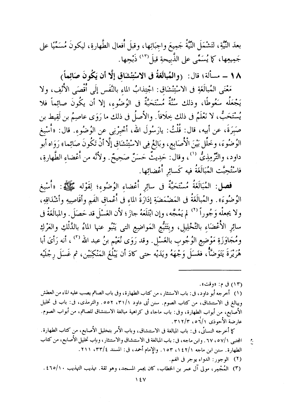 ١٨ - مسألة؛ قال: (والمُبالَغَةُ في الاسْتِنْشَاقِ إلَّا أن يَكُونَ صَائِمًا)