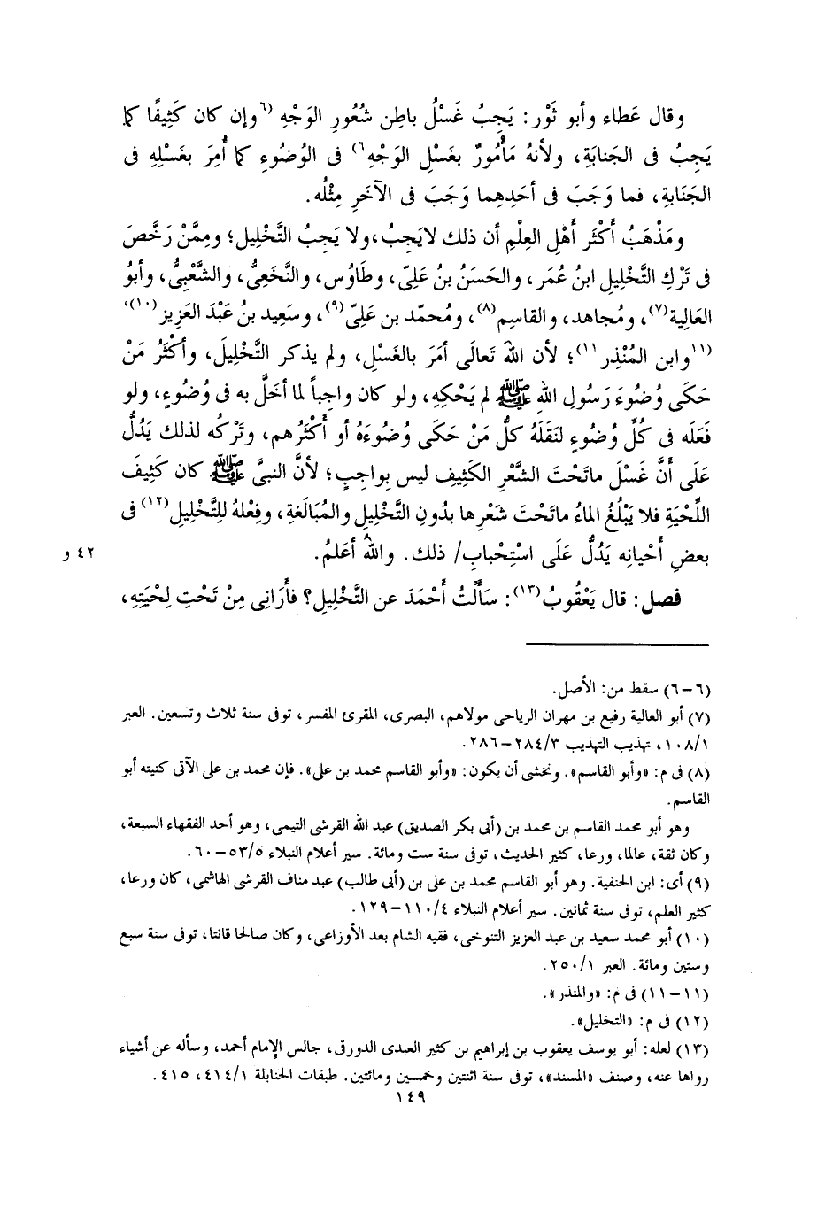 ومَذْهَبُ أَكْثَر أَهْلِ العِلْمِ أن ذلك لا يَجِبُ، ولا يَجِبُ التَّخْلِيل؛ ومِمَّنْ رَخَّصَ في تَرْكِ التَّخْلِيلِ ابنُ عُمَر، والحَسَنُ بنُ عَلِىّ، وطَاوُس، والنَّخَعِىُّ، والشَّعْبِىُّ، وأبُو العَالِية (٧)، ومُجاهد، والقاسِم (٨)، ومُحمّد بن عَلِىّ (٩)، وسَعِيد بنُ عَبْدَ العَزِيز (١٠)، [وابن المُنْذِر] (١١)؛ لأن اللهَ تَعالَى أمَرَ بالغَسْلِ، ولم يذكر التَّخْلِيلَ، وأكْثَرُ مَنْ حَكَى وُضُوءَ رَسُولِ اللهِ -صلى اللَّه عليه وسلم- لم يَحْكِهِ، ولو كان واجِبًا لما أخَلَّ به في وُضُوءٍ، ولو فَعَلَه في كُلِّ وُضُوءٍ لنَقَلَهُ كلُّ مَنْ حَكَى وُضُوءَهُ أو أَكْثَرُهم، وتَرْكُه لذلك يَدُلُّ عَلَى أنَّ غَسْلَ ما تَحْتَ الشَّعْرِ الكَثِيفِ ليس بِواجِبٍ؛ لأنَّ النبيَّ -صلى اللَّه عليه وسلم- كان كَثِيفَ اللِّحْيَةِ فلا يَبْلُغُ الماءُ ما تَحْتَ شَعْرِها بدُونِ التَّخْلِيلِ والمُبَالَغةِ، وفِعْلهُ للِتَّخْلِيلِ (١٢) في بعضِ أحْيانِه يَدُلُّ عَلَى اسْتِحْبابِ ذلك. واللهُ أعَلمُ.