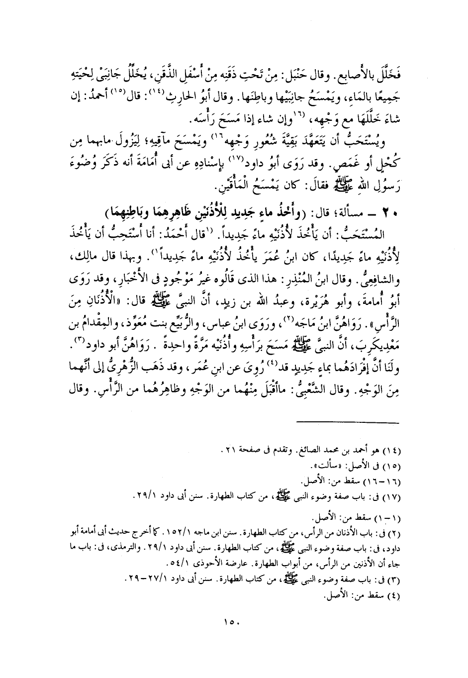 المُسْتَحَبُّ: أن يَأْخُذَ لأُذُنَيْهِ ماءً جَدِيدًا. [قال أَحْمَدُ: أنا أَسْتَحِبُّ أن يَأْخُذَ لِأُذُنَيْهِ ماءً جَدِيدًا، كان ابنُ عُمَرَ يأْخُذُ لأُذُنَيْهِ ماءً جَدِيدًا] (١). وبهذا قال مالِك، والشافِعِىُّ. وقال ابنُ المُنْذِرِ: هذا الذي قَالُوه غيرُ مَوْجُودٍ في الأَخْبَارِ، وقد رَوَى أبُو أُمامةَ، وأبو هُرَيْرة، وعبدُ اللَّه بن زيدٍ، أنَّ النبيَّ -صلى اللَّه عليه وسلم- قال: "الْأُذُنَانِ مِنَ الرَّأْسِ". رَوَاهُنَّ ابنُ مَاجَه (٢)، ورَوَى ابنُ عباس، والرُّبَيِّع بنت مُعَوِّذ، والمِقْدامُ بن مَعْدِيكَرِبَ، أنَّ النبيَّ -صلى اللَّه عليه وسلم- مَسَحَ برَأْسِهِ وأُذُنَيْه مَرَّةً واحدِةً. رَوَاهُنَّ أبو داود (٣). ولَنَا أنَّ إفْرَادَهُما بماءٍ جَدِيدٍ قد (٤) رُوِىَ عن ابنِ عُمَر، وقد ذَهَب الزُّهْرِىُّ إلى أنَّهما مِنَ الوَجْهِ. وقال الشَّعْبِىُّ: ما أقْبَلَ مِنْهُما من الوَجْهِ وظاهِرُهُما من الرَّأْسِ. وقال