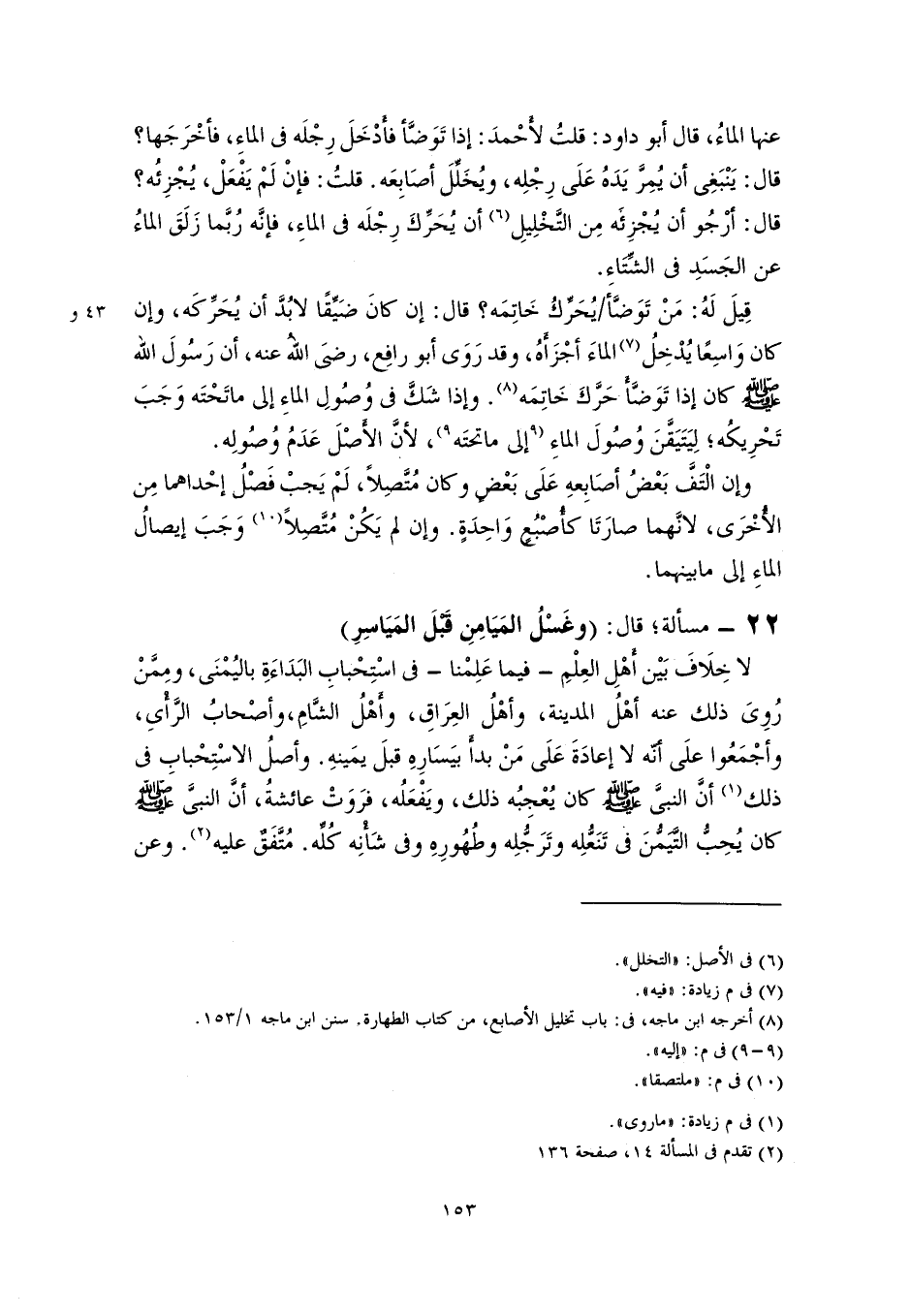 عنها الماءُ، قال أبو داود: قلتُ لأَحْمدَ: إذا تَوَضَّأ فأَدْخَلَ رِجْلَه في الماءِ، فأخْرَجَها؟ قال: يَنْبَغِى أن يُمِرَّ يَدَهُ عَلَى رِجْلِه، ويُخَلِّلَ أصَابِعَه. قلتُ: فإنْ لَمْ يَفْعَلْ، يُجْزِئُه؟ قال: أرْجُو أن يُجْزِئَه مِن التَّخْلِيلِ (٦) أن يُحَرِّكَ رِجْلَه في الماءِ، فإنَّه رُبَّما زَلَقَ الماءُ عن الجَسَدِ في الشِّتَاءِ.