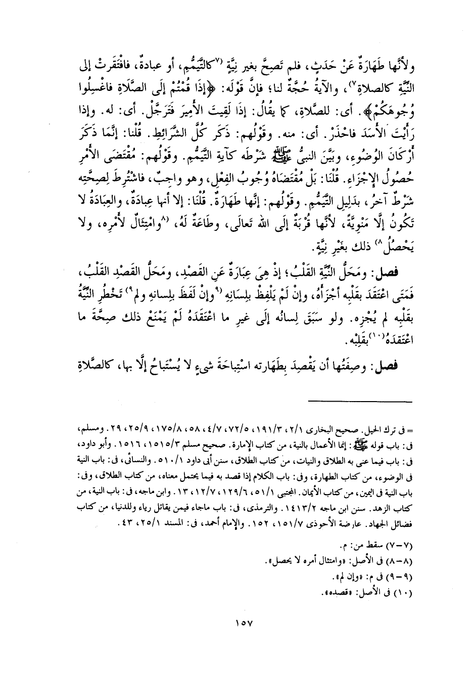 ولأنَّها طَهَارَةٌ عَنْ حَدَثٍ، فلم تَصِحَّ بغير نِيَّةٍ [كالتَّيَمُّمِ، أو عبادةٌ، فافْتَقَرتْ إلى النِّيَّةِ كالصلاةِ] (٧)، والآيةُ حُجَّةٌ لنا، فإنَّ قَوْلَه: {إِذَا قُمْتُمْ إِلَى الصَّلَاةِ فَاغْسِلُوا وُجُوهَكُمْ}. أي: للصَّلاةِ، كما يُقالُ: إذَا لَقِيتَ الأَمِيرَ فَتَرَجَّلْ. أي: له. وإذا رَأَيْتَ الأَسَدَ فاحْذَرْ. أي: منه. وقَوْلُهم: ذَكَر كُلَّ الشَّرَائِطِ. قُلْنا: إنَّمَا ذَكَرَ أَرْكَانَ الوُضُوءِ، وبَيَّنَ النبيُّ -صلى اللَّه عليه وسلم- شَرْطَه كآيةِ التَّيَمُّمِ. وقَوْلُهم: مُقْتَضَى الأَمْرِ حُصُولُ الإِجْزَاءِ. قُلْنَا: بَلْ مُقْتَضَاهُ وُجُوبُ الفِعْلِ، وهو واجِبٌ، فاشْتُرِطَ لِصِحَّتِه شَرْطٌ آخرُ، بدَلِيلِ التَّيَمُّمِ. وقَوْلُهم: إنَّها طَهَارَةٌ. قُلْنَا: إلا أنها عِبادَةٌ، والعِبَادَةُ لا تَكُونُ إلَّا مَنْوِيَّةً، لأنَّها قُرْبَةٌ إلَى اللَّه تَعالَى، وطَاعَةٌ لَهُ، [وامْتِثَالٌ لأَمْرِه، ولا يَحْصُلُ] (٨) ذلك بغَيْرِ نِيَّةٍ.