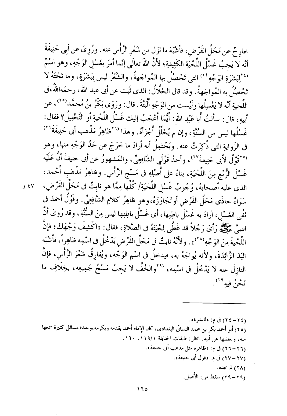 خارِجٌ عن مَحَلِّ الفَرْضِ، فأشْبَهَ ما نَزَل من شَعْرِ الرَّأْسِ عنه. ورُوِىَ عن أبي حَنِيفَةَ أنَّه لا يَجِبُ غَسْلُ اللِّحْيَةِ الكَثِيفةِ؛ لأنَّ اللهَ تعالَى إنّما أمرَ بغَسْلِ الوَجْهِ، وهو اسْمٌ [لِبَشَرَةِ الوَجْهِ] (٢٤) التي تَحْصُلُ بها المُواجَهةُ، والشَّعْرُ ليس بِبَشَرَةٍ، وما تَحْتَهُ لا تَحْصُلُ به المُواجَهةُ. وقد قال الخَلَّالُ: الذي ثَبَت عن أبي عبد اللَّه، رحمَه اللهُ، في اللِّحْيةِ أنَّه لا يَغْسِلُها ولَيْست من الوَجْهِ أَلْبَتَّةَ. قال: ورَوَى بَكْرُ بنُ مُحمَّد (٢٥)، عن أبيهِ، قال: سألتُ أَبا عَبْدِ اللهِ: أَيُّمَا أَعْجَبُ إليك غَسْلُ اللِّحْيةِ أو التَّخْلِيلُ؟ فقال: غَسْلُها ليس من السُنَّةِ، وإن لم يُخَلِّلْ أَجْزَأهُ. وهذا [ظاهِرُ مَذْهب أبى حَنِيفَةَ] (٢٦) في الرِّوايةِ التي ذُكِرَتْ عنه. ويَحْتَمِلُ أنه أرادَ ما خَرَجَ عن حَدِّ الوَجْهِ منها، وهو [قَوْلٌ لأبي حَنِيفةَ] (٢٧)، وأحدُ قَوْلَىِ الشَّافِعِىِّ، والمَشهورُ عن أبي حنيفةَ أنَّ عَلَيْه غَسْلَ الرُّبْعِ مِنَ اللِّحْيَةِ، بناءً على أَصْلِهِ في مَسْحِ الرَّأْسِ. وظاهِرُ مَذْهَبِ أَحْمد، الذي عليه أصحابهُ، وُجُوبُ غَسْلِ اللِّحْيَةِ كُلِّها مِمَّا هو نابِتٌ في مَحَلِّ الفَرْضِ، سَوَاءٌ حاذَى مَحَلَّ الفَرْضِ أو تَجَاوَزَهُ، وهو ظاهِرُ كلامِ الشَّافِعِىِّ. وقَوْلُ أحمدَ في نَفْى الغَسْلِ، أرادَ به غَسْلَ باطِنِها، أي غَسْلُ باطِنِها ليس مِنَ السُّنَّةِ، وقد رُوِىَ أنَّ النبيَّ -صلى اللَّه عليه وسلم- رَأىَ رَجُلًا قد غَطَّى لِحْيَتَهُ في الصَّلاةِ، فقال: "اكْشِفْ وَجْهَكَ؛ فإنَّ اللِّحْيةَ مِنَ الوَجْهِ (٢٨) ". ولأنَّهُ نابتٌ في مَحَلِّ الفَرْضِ يَدْخُلُ في اسْمِه ظاهِرًا، فأشْبَه اليَدَ الزَّائِدَةَ، ولأنه يُواجَهُ به، فيدخلُ في اسْمِ الوَجْه، ويُفارِقُ شَعْرَ الرَّأْسِ، فإنَّ النازِلَ عنه لا يَدْخُلُ في اسْمِه، [والخُفُّ لا يَجِبُ مَسْحُ جَمِيعِه، بخِلَافِ ما نَحْنُ فيهِ] (٢٩).
