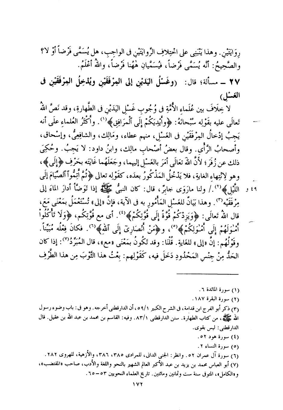لا خِلَافَ بين عُلَماءِ الأُمَّةِ في وُجُوبِ غَسْلِ اليَدَيْنِ في الطَّهارةِ، وقد نَصَّ اللهُ تَعالَى عليه بقَوْلِه سُبْحانَهُ: {وَأَيْدِيَكُمْ إِلَى الْمَرَافِقِ} (١). وأَكْثَرُ العُلماءِ علَى أنه يَجِبُ إدْخالُ المِرْفَقَيْنِ في الغَسْلِ، منهم عطاء، ومَالِك، والشافِعِىُّ، وإسْحاق، وأَصحابُ الرَّأْىِ. وقال بعضُ أصْحابِ مالِك، وابنُ داود: لا يَجِبُ. وحُكِىَ ذلك عن زُفَرَ؛ لأنَّ اللهَ تعَالَى أمَرَ بالغَسْلِ إليهما، وجَعَلَهُما غَايَتَه بحَرْفِ {إِلَى}، وهو لِانْتِهاءِ الغايةِ، فلا يَدْخُلُ المَذْكُورُ بعدَه، كقَوْلِه تعالى {ثُمَّ أَتِمُّوا الصِّيَامَ إِلَى اللَّيْلِ} (٢). ولنا ما رَوَى جابِرٌ، قال: كان النبيُّ -صلى اللَّه عليه وسلم- إذا تَوَضَّأ أدارَ الماءَ إلى مِرْفَقَيْه (٣). وهذا بَيَانٌ للغَسْلِ المَأْمُورِ به في الآية، فإنَّ "إلى" تُسْتَعْمَلُ بمَعْنَى مَعَ، قال اللهُ تَعالَى: {وَيَزِدْكُمْ قُوَّةً إِلَى قُوَّتِكُمْ} (٤). أي مع قُوَّتِكُم، {وَلَا تَأْكُلُوا أَمْوَالَهُمْ إِلَى أَمْوَالِكُمْ} (٥)، و {مَنْ أَنْصَارِي إِلَى اللَّهِ} (٦). فكانَ فِعْلُه مُبَيِّنًا. وقَوْلُهُم: إنَّ "إلى" للغَايةِ. قُلْنَا: وقد تَكُونُ بمَعْنَى "مع"، قال المُبَرِّدُ (٧): إذا كان الحَدُّ مِنْ جِنْسِ المَحْدُودِ دَخَلَ فيه، كَقَوْلِهم: بِعْتُ هذا الثَّوْبَ مِن هذا الطَّرْفِ