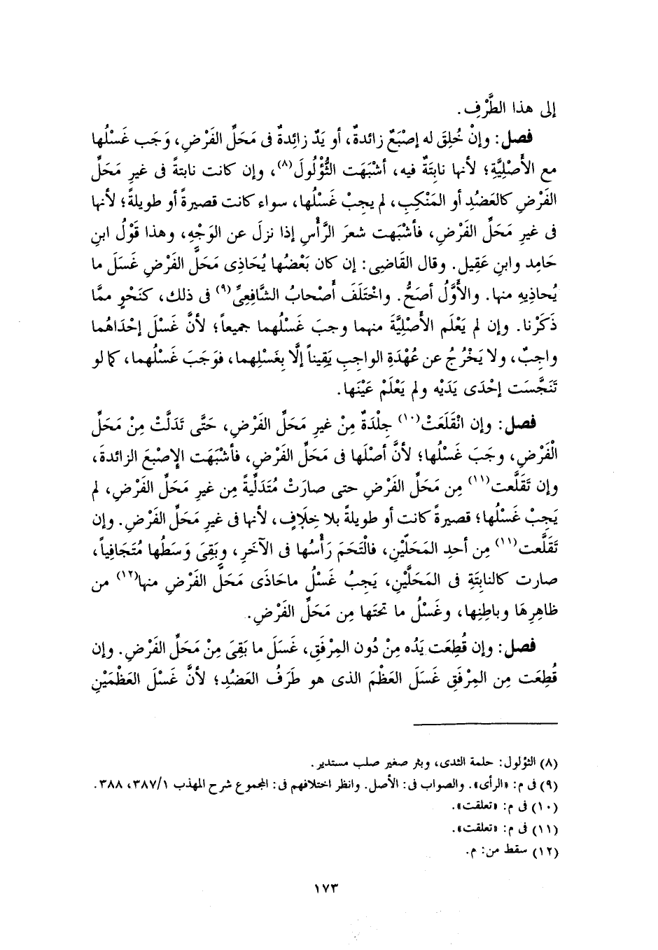 فصل: وإنْ خُلِقَ له إصْبَعٌ زائدةٌ، أو يَدٌ زائِدةٌ في مَحَلِّ الفَرْضِ، وَجَب غَسْلُها مع الأَصْلِيَّةِ؛ لأنها نابِتَةٌ فيه، أشْبَهَت الثُّؤْلُولَ (٨)، وإن كانت نابتةً في غيرِ مَحَلِّ الفَرْضِ كالعَضُدِ أو المَنْكِبِ، لم يجِبْ غَسْلُها، سواء كانت قصيرةً أو طويلةً؛ لأنها في غيرِ مَحَلِّ الفَرْضِ، فأشْبَهت شعرَ الرَّأْسِ إذا نزلَ عن الوَجْهِ، وهذا قَوْلُ ابنِ حَامِد وابنِ عَقِيل. وقال القَاضِى: إن كان بَعْضُها يُحَاذِى مَحَلَّ الفَرْضِ غَسَلَ ما يُحاذِيهِ منها. والأَوَّلُ أصَحُّ. واخْتَلَفَ أَصْحابُ الشَّافِعِىِّ (٩) في ذلك، كنَحْوٍ ممَّا ذَكَرْنا. وإن لم يَعْلَم الأَصْلِيَّةَ منهما وجبَ غَسْلُهما جميعًا؛ لأنَّ غَسْلَ إحْدَاهُما واجِبٌ، ولا يَخْرُجُ عن عُهْدَةِ الواجِبِ يَقِينًا إلَّا بِغَسْلِهما، فوَجَبَ غَسْلُهما، كما لو تَنَجَّسَت إحْدَى يَدَيْه ولم يَعْلَمْ عَيْنَها.