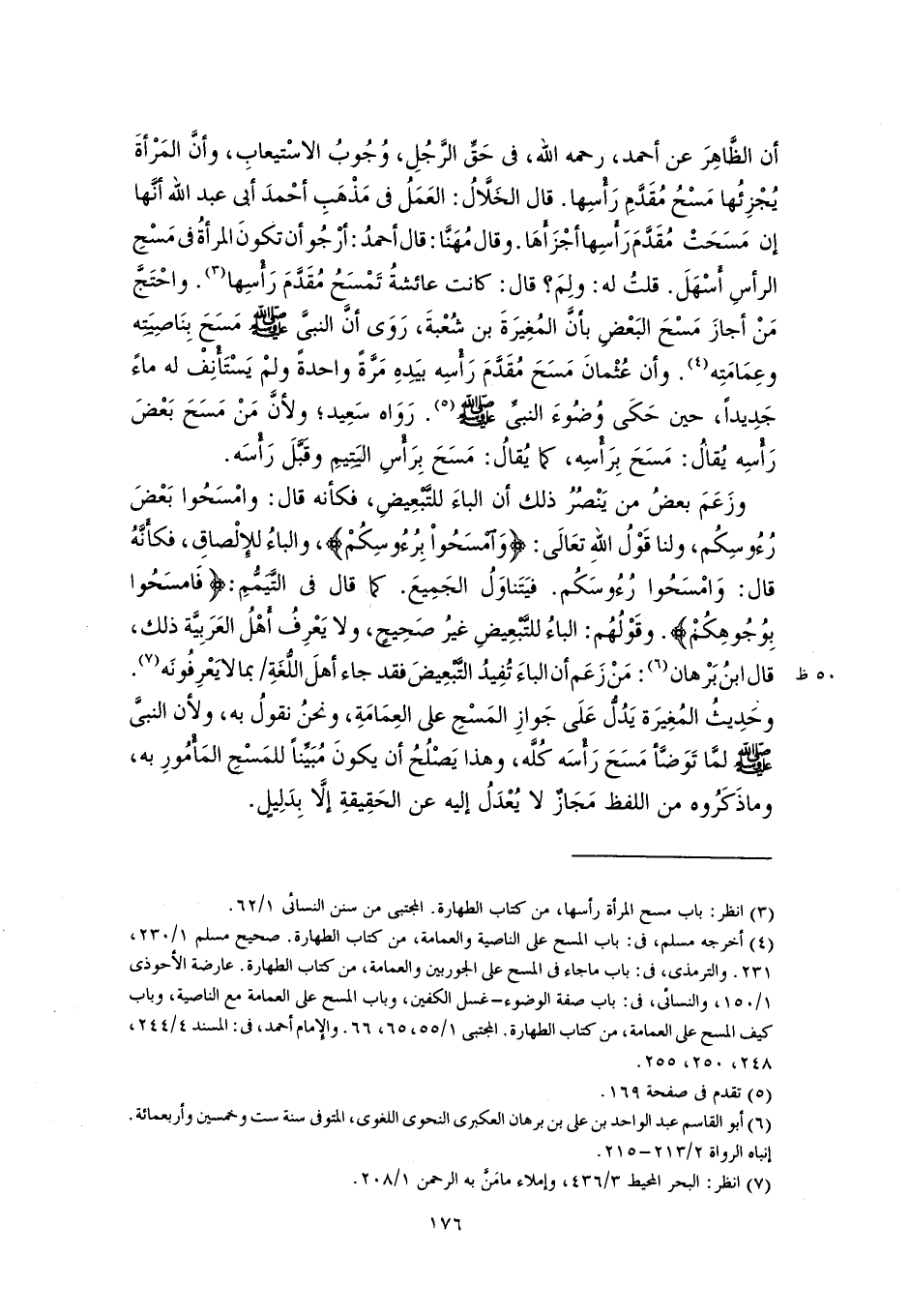 وزَعَمَ بعضُ من يَنْصُرُ ذلك أن الباءَ للتَّبْعِيضِ، فكأنه قال: وامْسَحُوا بَعْضَ رُءُوسِكُم، ولنا قَوْلُ اللهِ تعَالَى: {وَامْسَحُوا بِرُءُوسِكُمْ}، والباءُ للإِلْصاقِ، فكأَنَّهُ قال: وَامْسَحُوا رُءُوسَكُم. فيَتَناوَلُ الجَمِيعَ. كما قال في التَّيَمُّمِ: {فَامْسَحُوا بِوُجُوهِكُمْ}. وقَوْلُهُم: الباءُ للتَّبْعِيضِ غيرُ صَحِيحٍ، ولا يَعْرِفُ أَهْلُ العَرَبِيَّة ذلك، قال ابنُ بَرْهان (٦): مَنْ زَعَم أن الباءَ تُفِيدُ التَّبْعِيضَ فقد جاء أهلَ اللُّغَةِ بما لا يَعْرِفُونَه (٧). وحَدِيثُ المُغِيرَة يَدُلُّ عَلَى جَوازِ المَسْحِ على العِمَامَةِ، ونحنُ نقولُ به، ولأن النبيَّ -صلى اللَّه عليه وسلم- لمَّا تَوَضَّأ مَسَحَ رَأْسَه كُلَّه، وهذا يَصْلُحُ أن يكونَ مُبَيِّنًا للمَسْحِ المَأْمُورِ به، وما ذَكَرُوه من اللفظ مَجَازٌ لا يُعْدَلُ إليه عن الحَقِيقةِ إلَّا بِدَلِيلٍ.